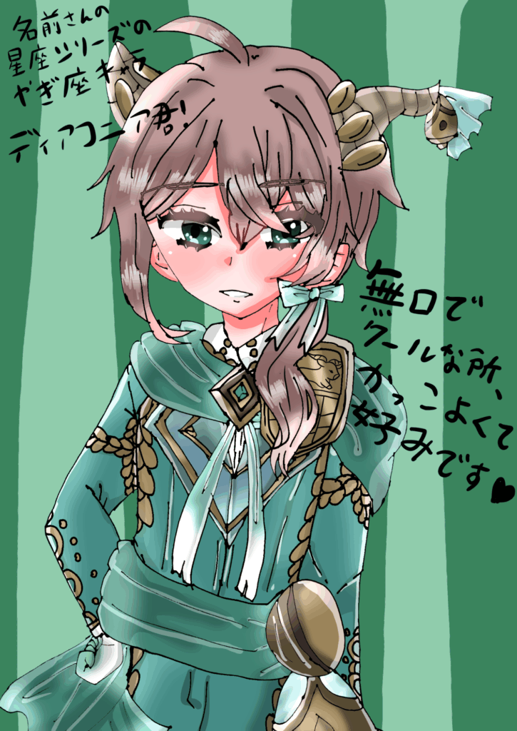 2枚目も同じく名前さんの星座シリーズのキャラ、ディアコニア君を描いてみました。無口だが、真面目な性格のところがカッコよくて好きです。また、執事と長髪なとこも私の好みに刺さりました。山羊と人間のハーフという設定も可愛いです。名前さんの描く各キャラの服装や装飾品が凝ってて素敵だなと見るたびに思います。