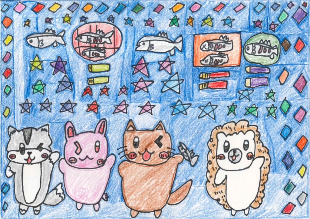 ハリネズミくんとネコちゃんとウサギちゃんとオオカミくんでサンマパーティーしています。