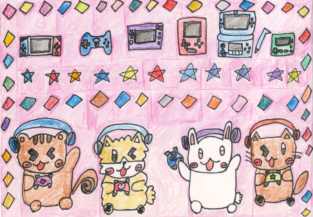 背景に、いろんなゲーム機を描いて楽しくかわいく見えるように工夫しました。