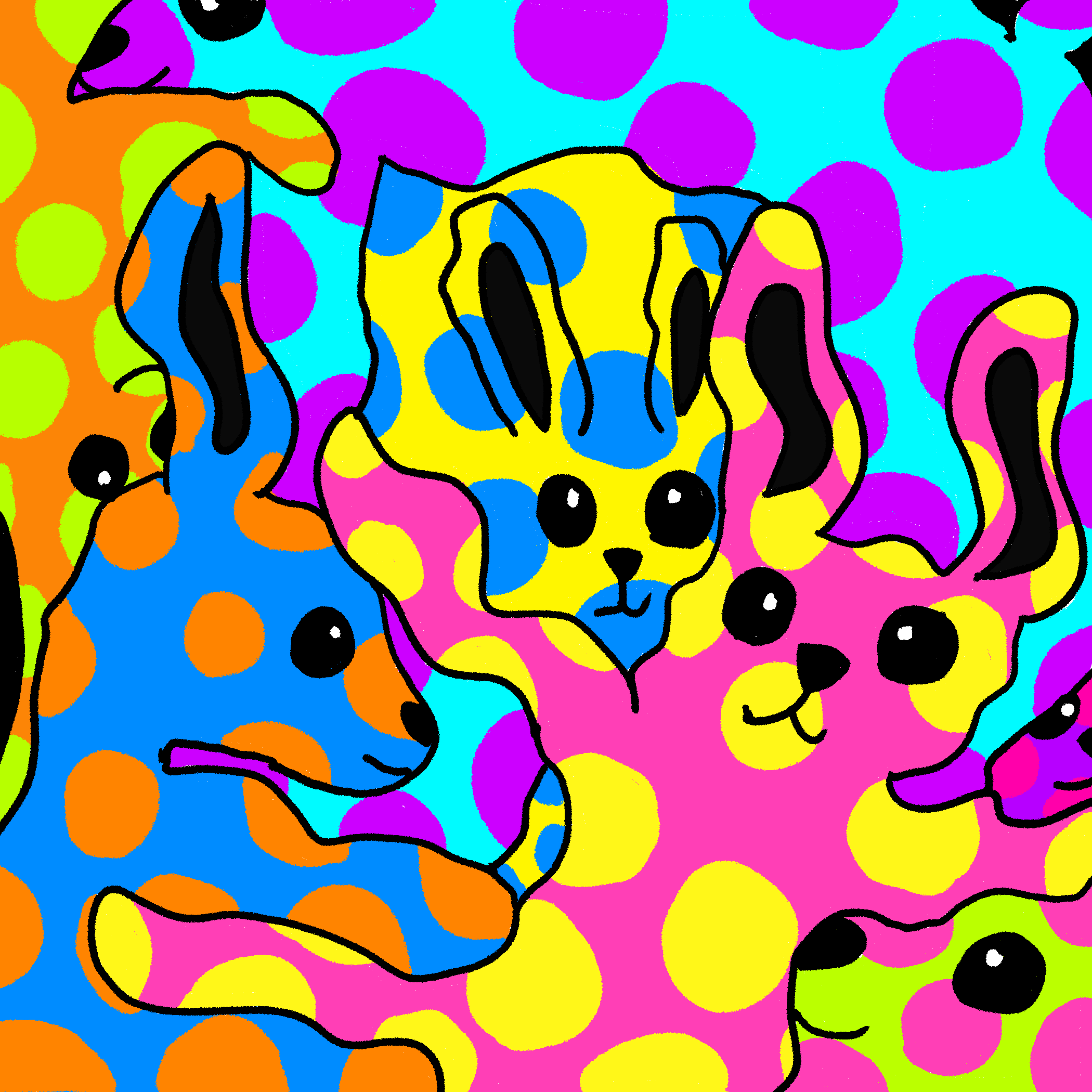 ぐにゃぐにゃとした兎をビビットなカラーでユニークに描いてみました。まるでパズルのように可愛い!
