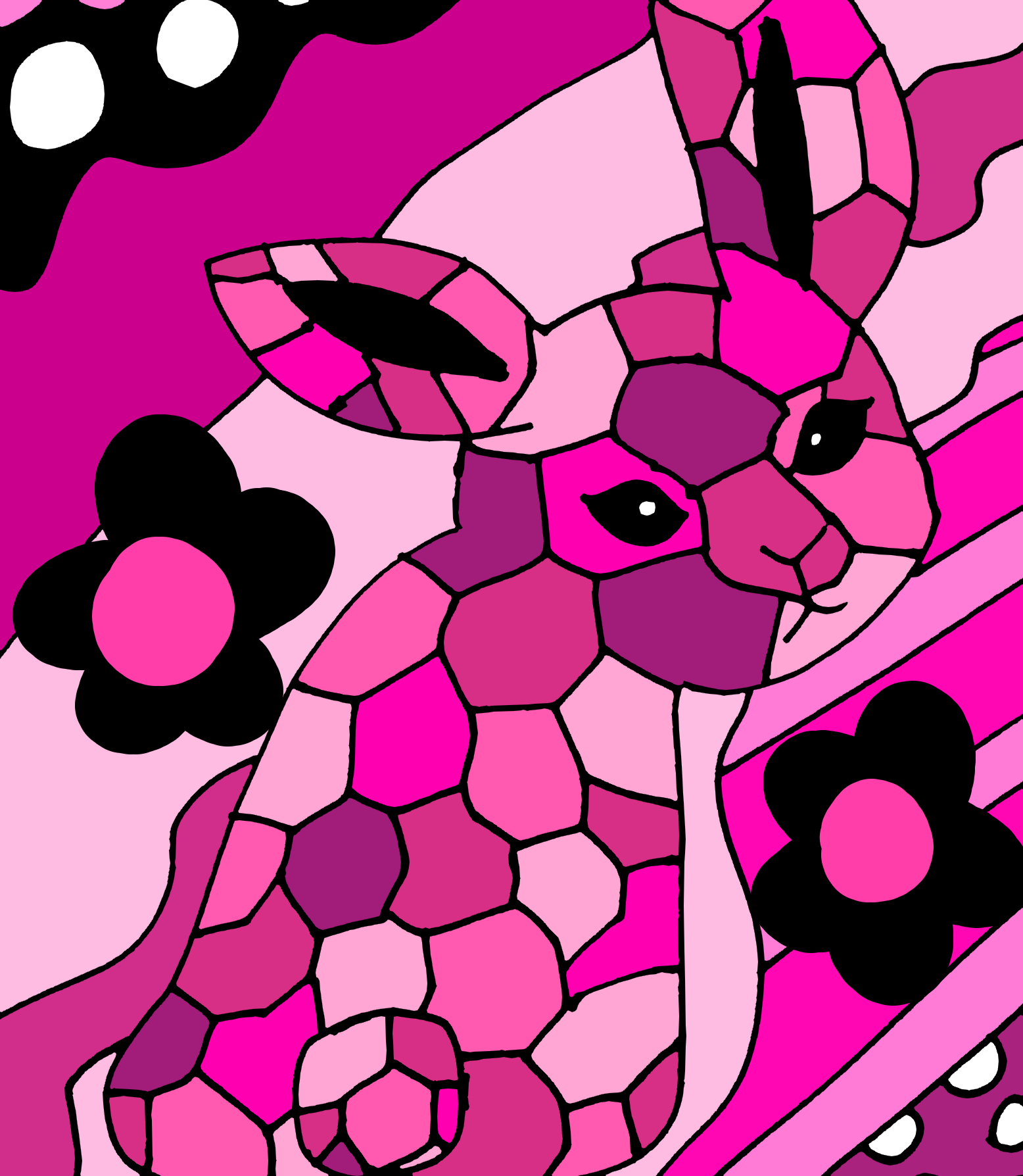 ステンドグラス風にピンク系の色で可愛く兎を描いてみました。また、背景の模様もオシャレに描いてみました。