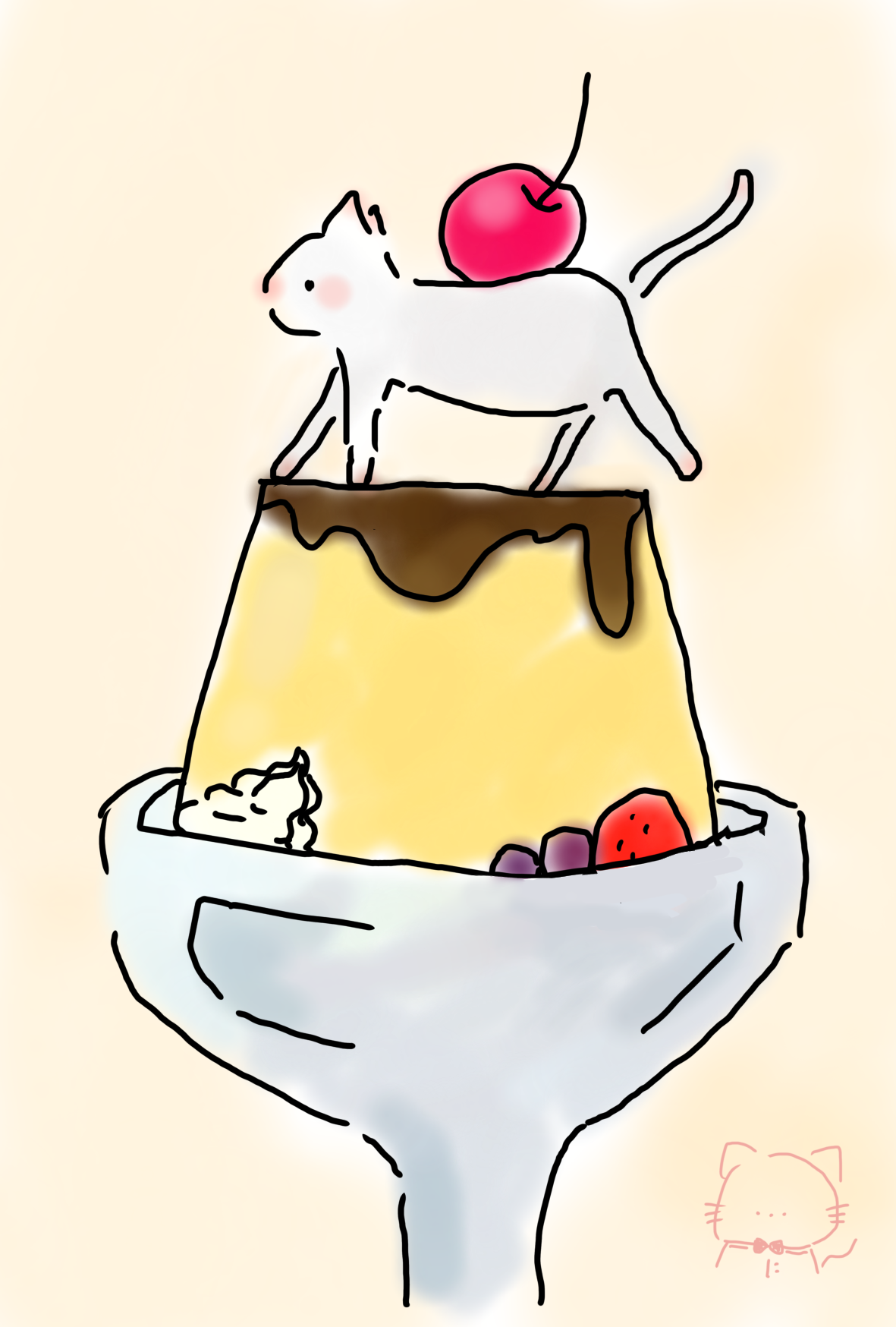 猫×スイーツ(プリン・ア・ラ・モード)を題材にしたこの作品では、柔らかい印象の色味を大事に描きました。