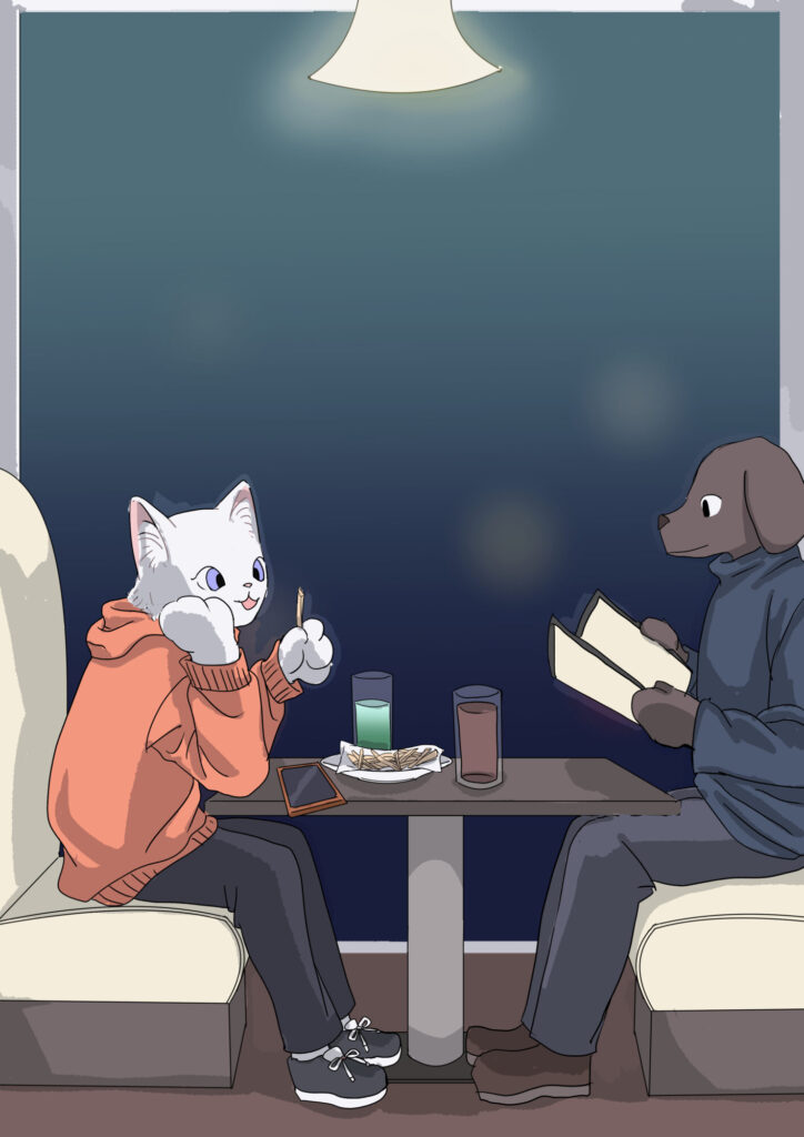 今回は夜のファミレスでしゃべっている猫と犬のイラストを描きました。