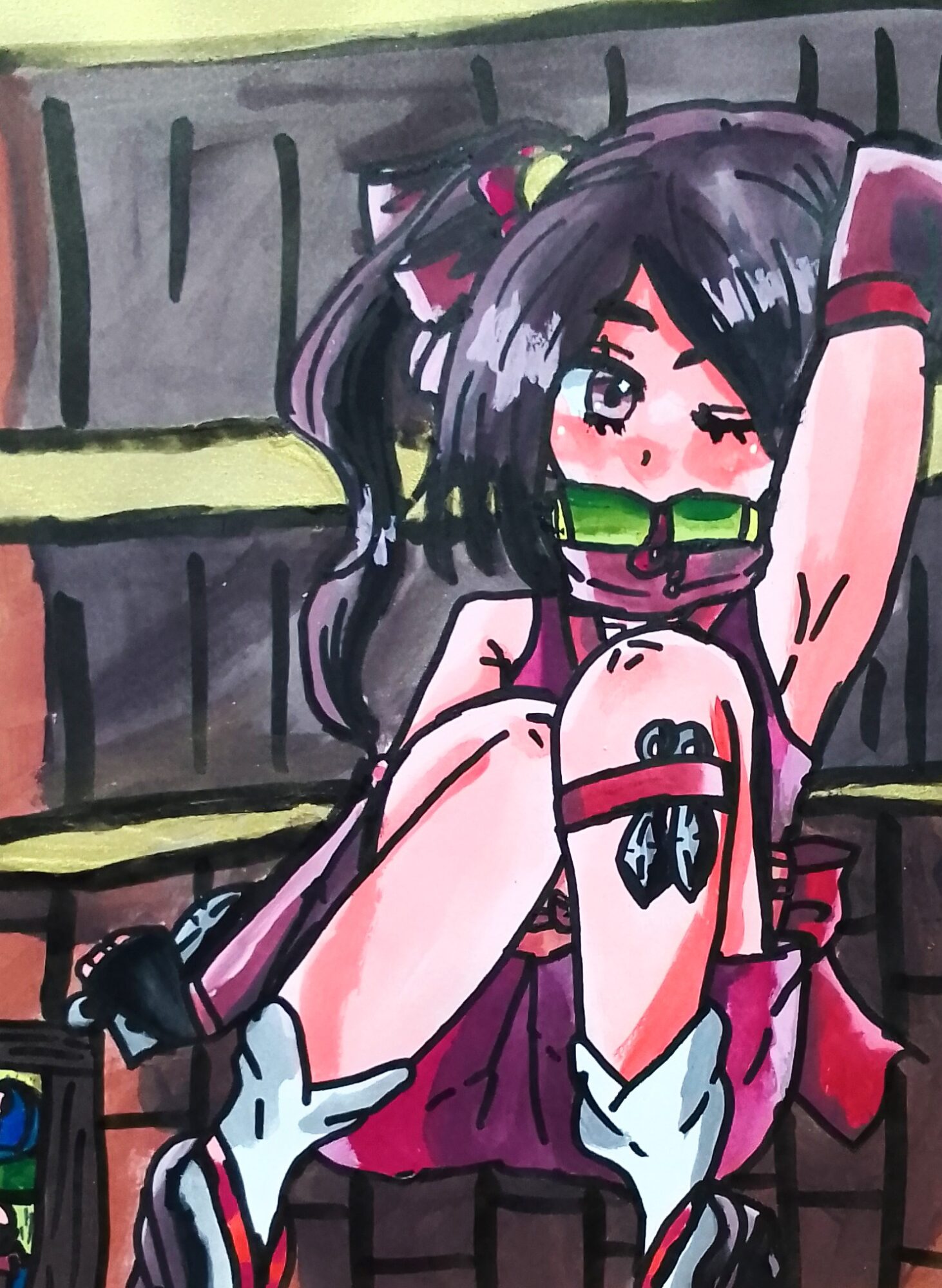 お城の天井裏にバレないように忍び込んでいるくノ一の女性を描いてみました。口に咥えている巻物には何が書かれてあるんだろう。