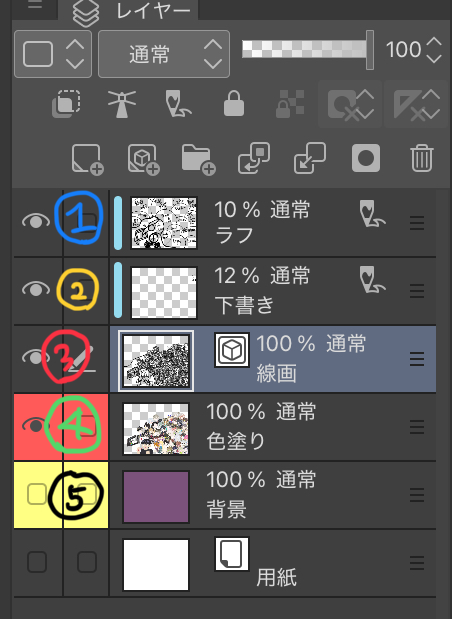 ③と④は線画、色塗りレイヤーです。線画をしている時が一番楽しい。
