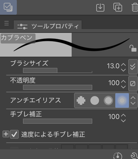 今はブラシサイズは13くらいですが筆圧を柔らかめに設定しているので問題はありません!手ぶれ補正はクリップスタジオだと100までが限界です。(私は手ぶれが酷いので最大にしています。)