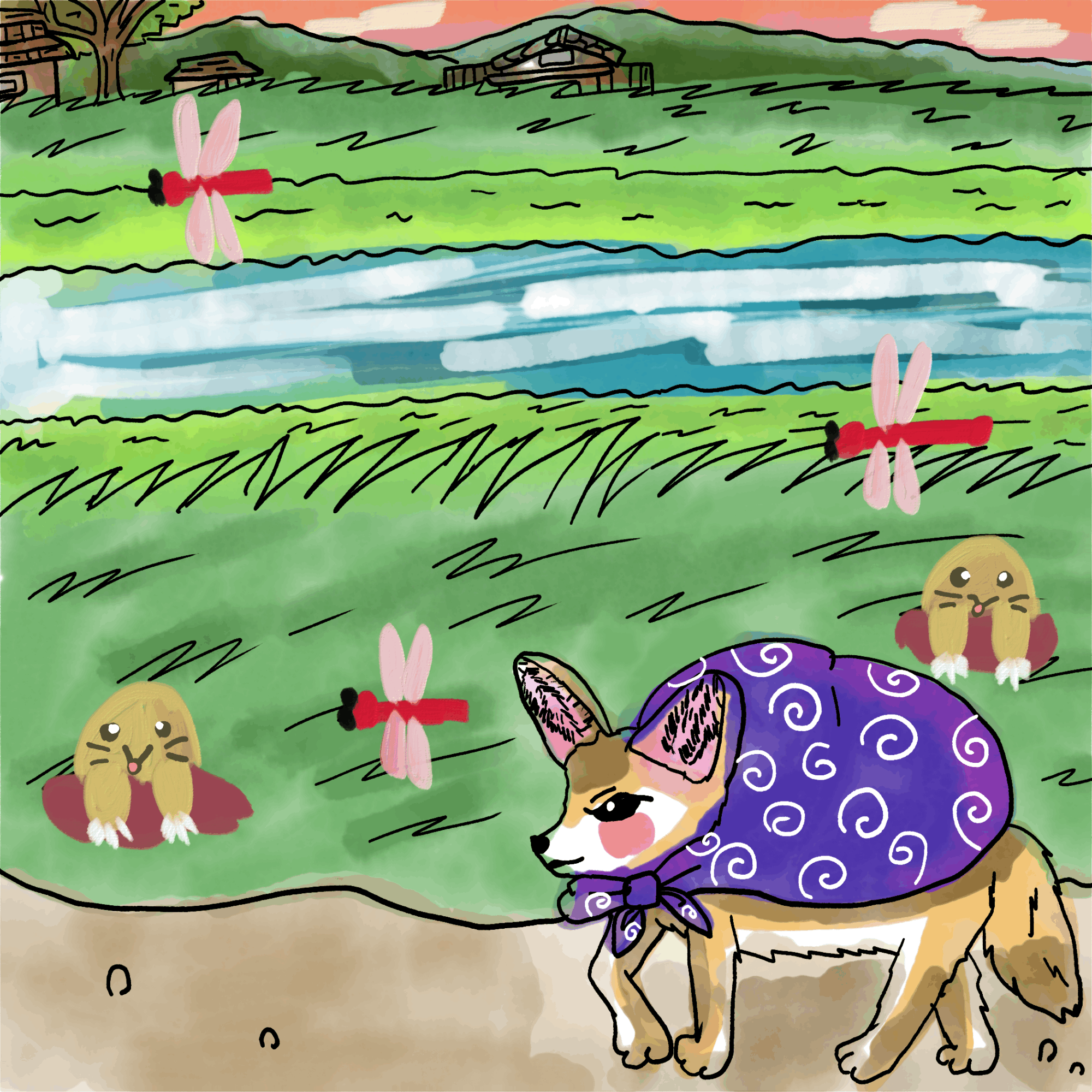 風呂敷を背中に背負って旅をしているフェネックギツネを描いてみました。