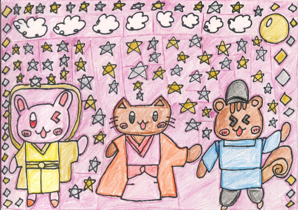 今回は、動物たちとかぐや姫モチーフの絵を描いてみました!