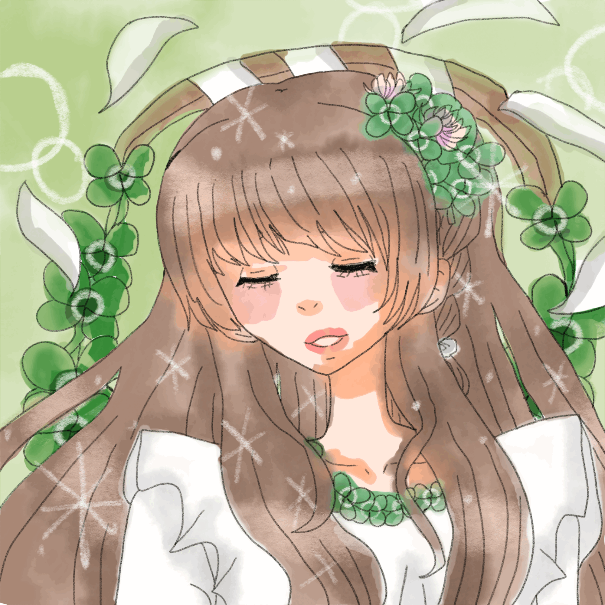 四葉のクローバーで幸せを感じている女性を水彩風に描いてみました。