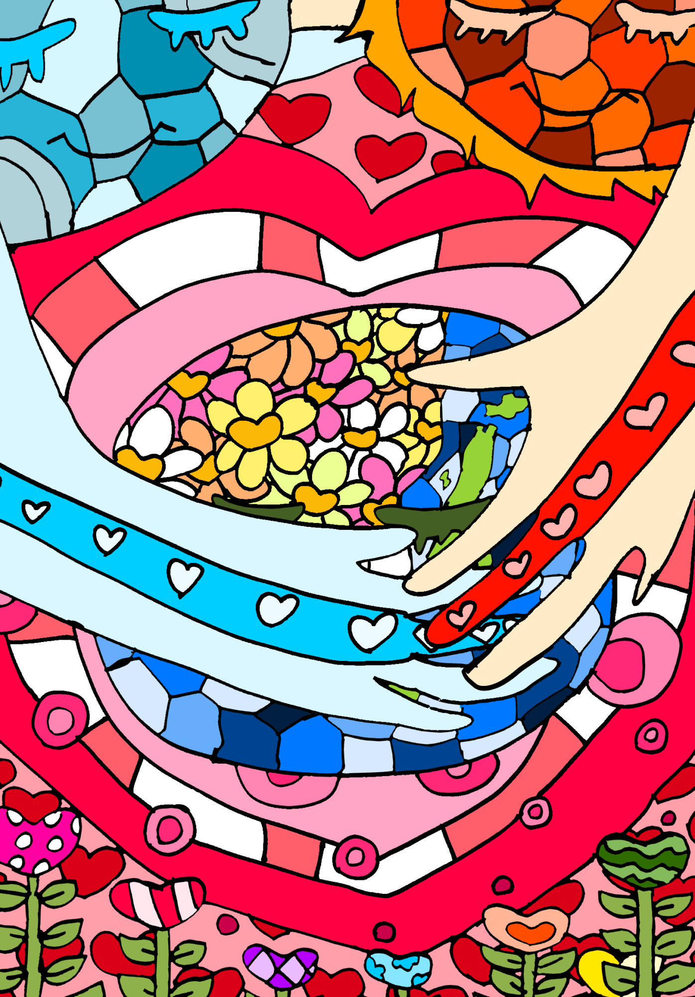 冬の展示物用イラストです!テーマは「愛」ということで、地球を優しく抱きしめて包んでいる太陽と月を描いてみました。世界が花のように、ハートのように優しい世界になるといいな。