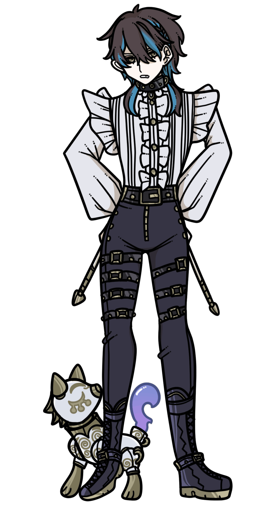 彼の近くにいる小さい体の生き物は「ガオティ」という犬の生き物です。名前は「シュウ」といいます。(性別は♂) 好きな食べ物は犬用クッキーで、好きなことは飼い主(アトラ)と散歩です。