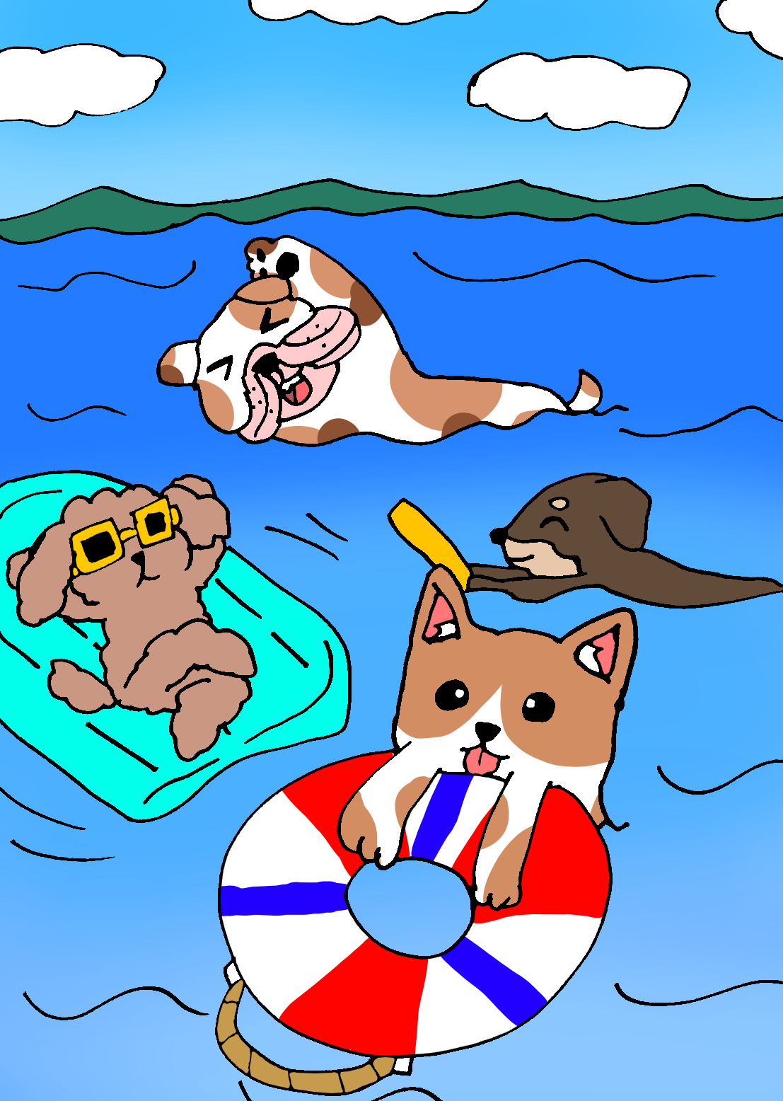 海で泳いだりくつろいだりとバカンスしている犬達を描いてみました。めっちゃ楽しそうですね。