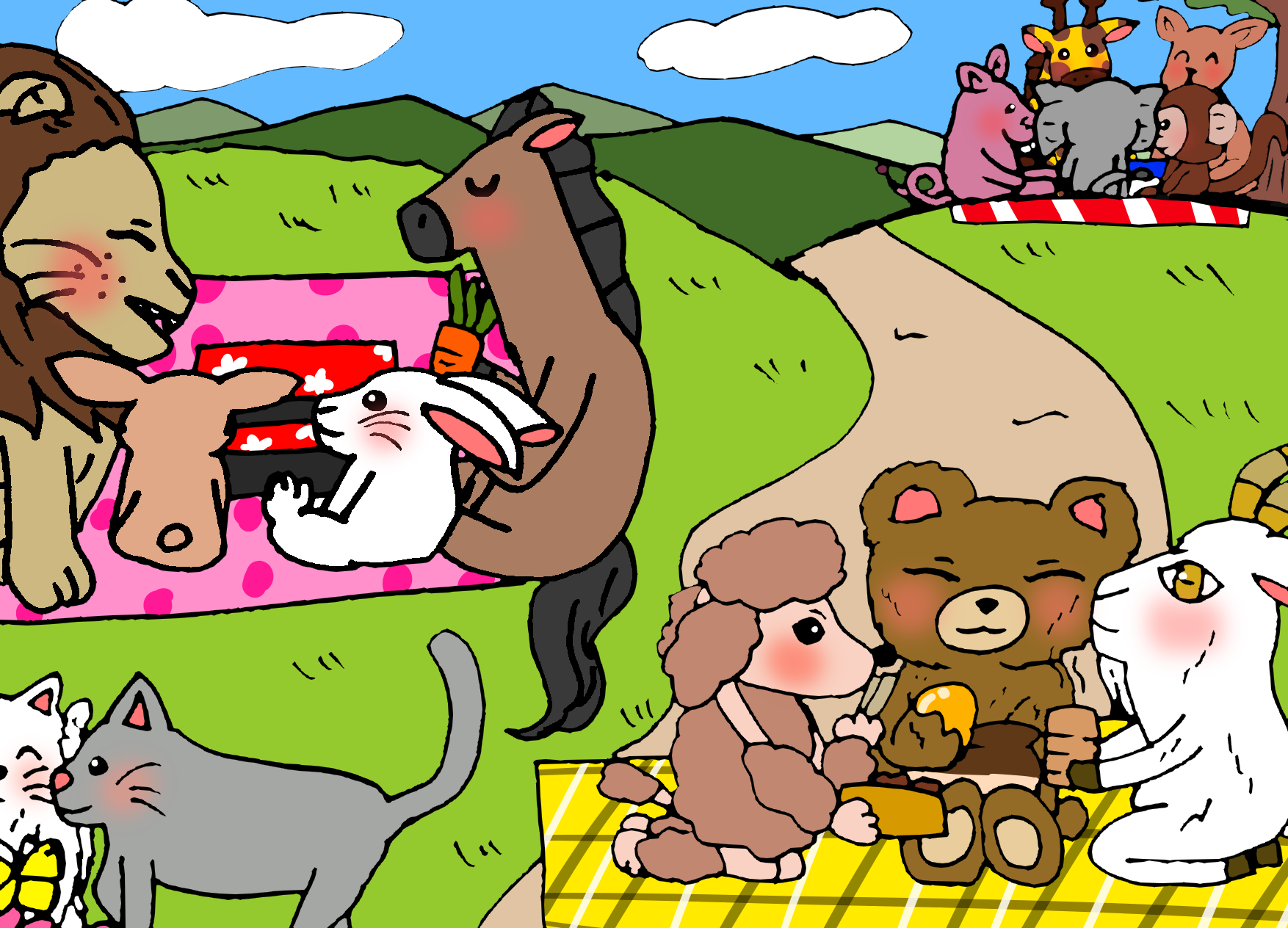 動物みんなで野原でピクニックをして楽しんでいる様子を描いてみました。