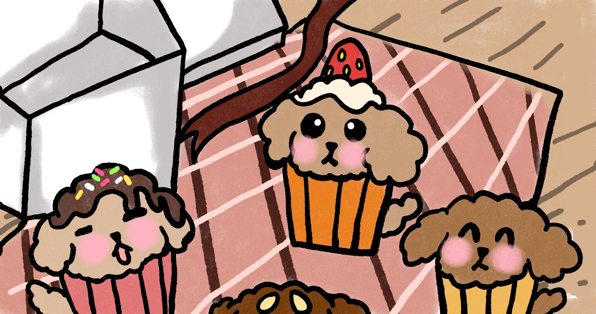 マフィンプードル達が楽しく話している様子を描いてみました。美味しそうですが、可愛くて食べれませんね。