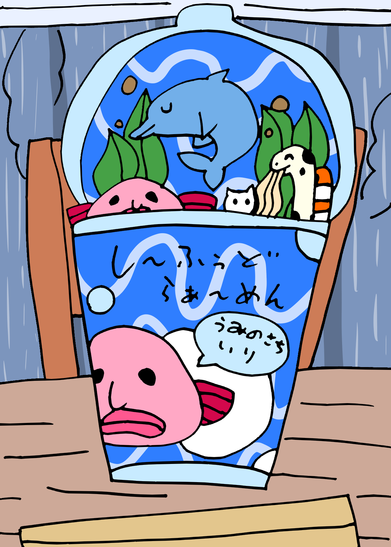 海の生き物入りのシーフードカップラーメンを描いてみました。