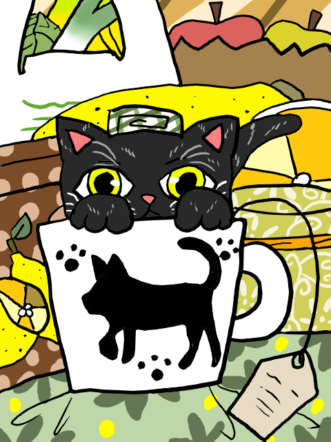 レモンティーの入っているマグカップに浸かっている黒猫を描いてみました。