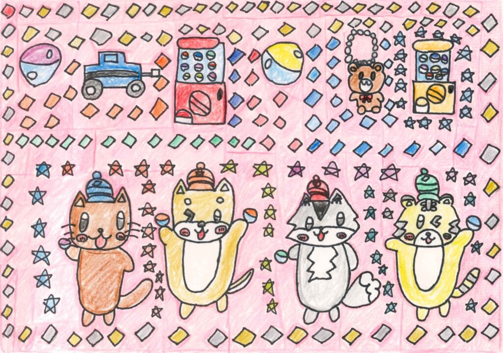 背景に、ガシャポンのマシンやクマのストラップヤミニカーやカプセルを描いて可愛く見えるように工夫しました。