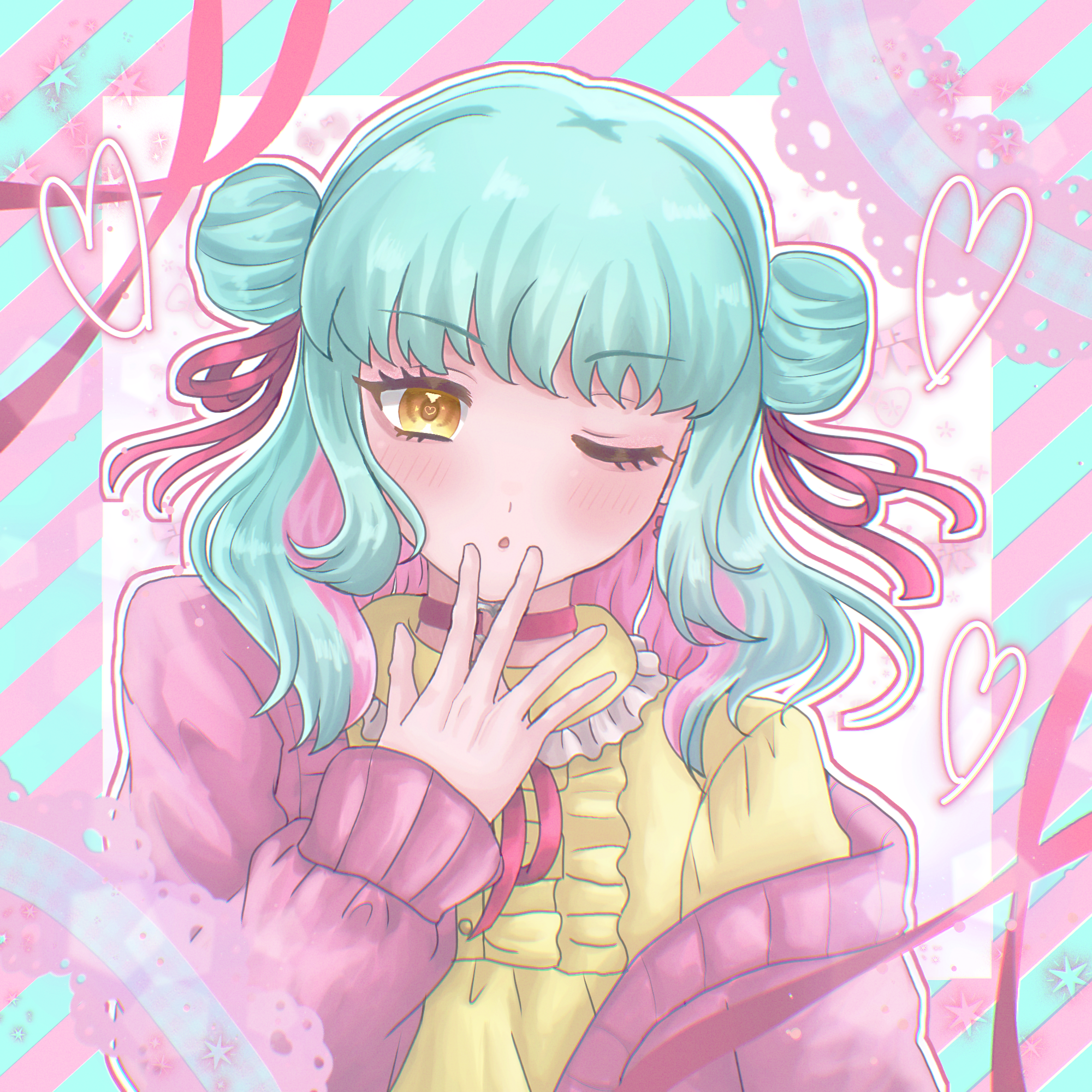 水色にピンクのインナーカラーのミディアムヘアに黄色のたれ目とつり眉がチャームポイントになります!