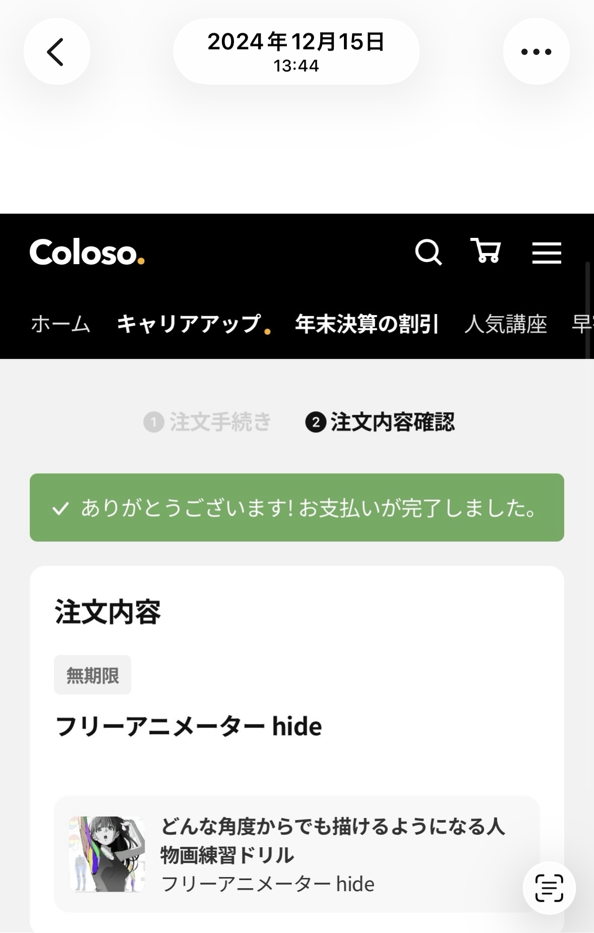 アニメーターのhideさんという方のColosoの講座を2024年12月15日に購入して、その時(買った瞬間)はやる気あったはずが、なかなか講座で勉強できず。。。