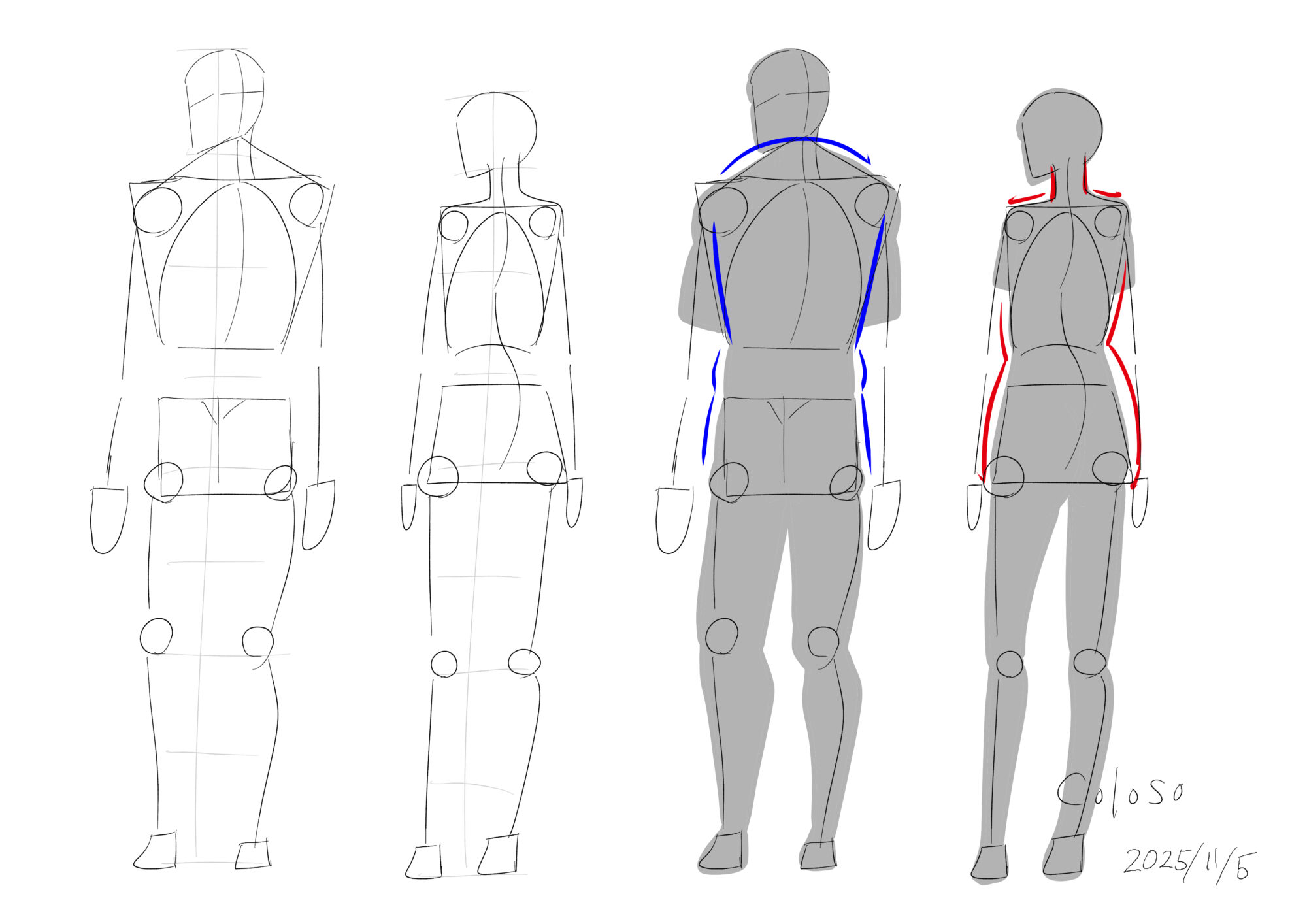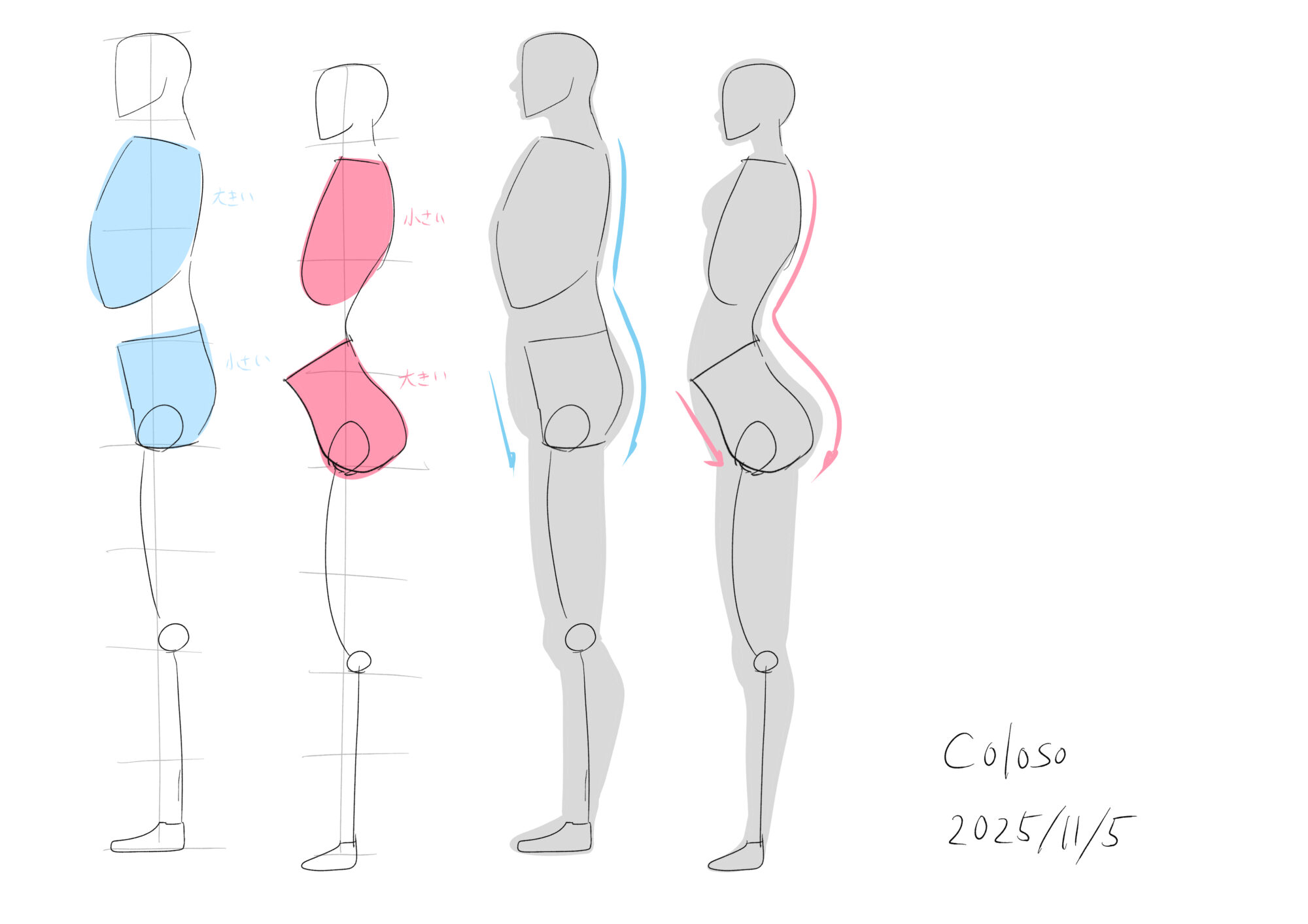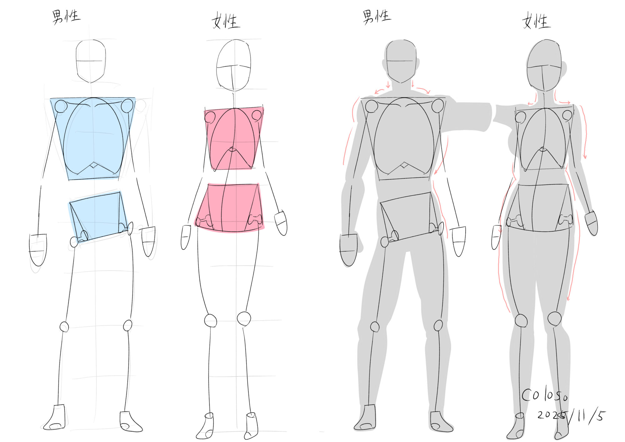 こちらが講座を参考(男女の体の特徴、描き分け)に11月5日、6日に練習したものです。
