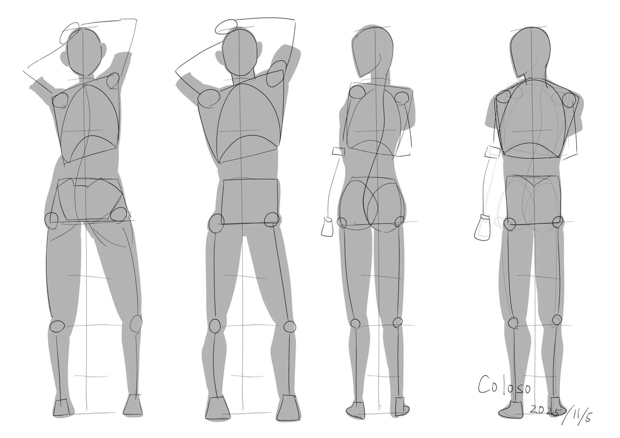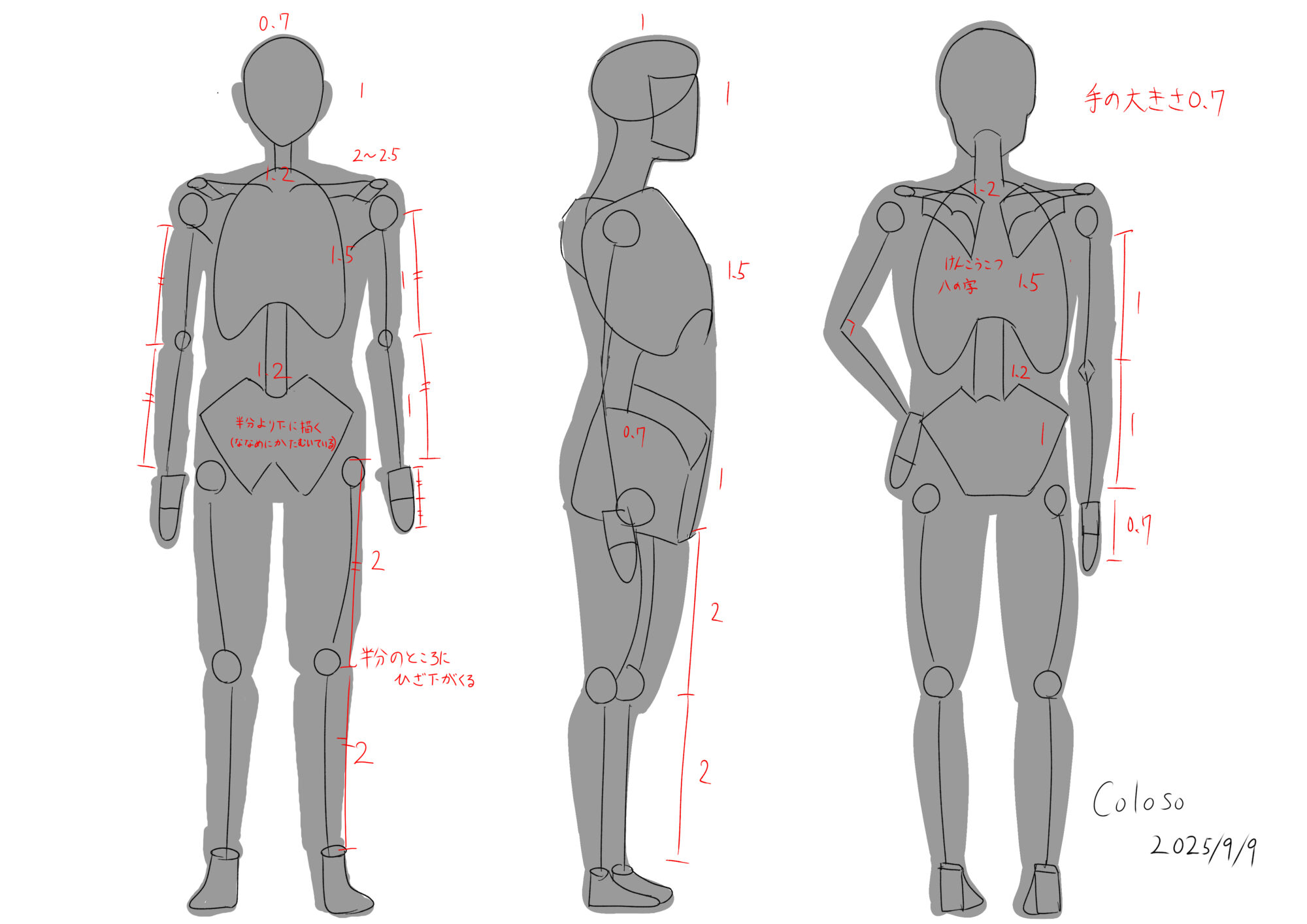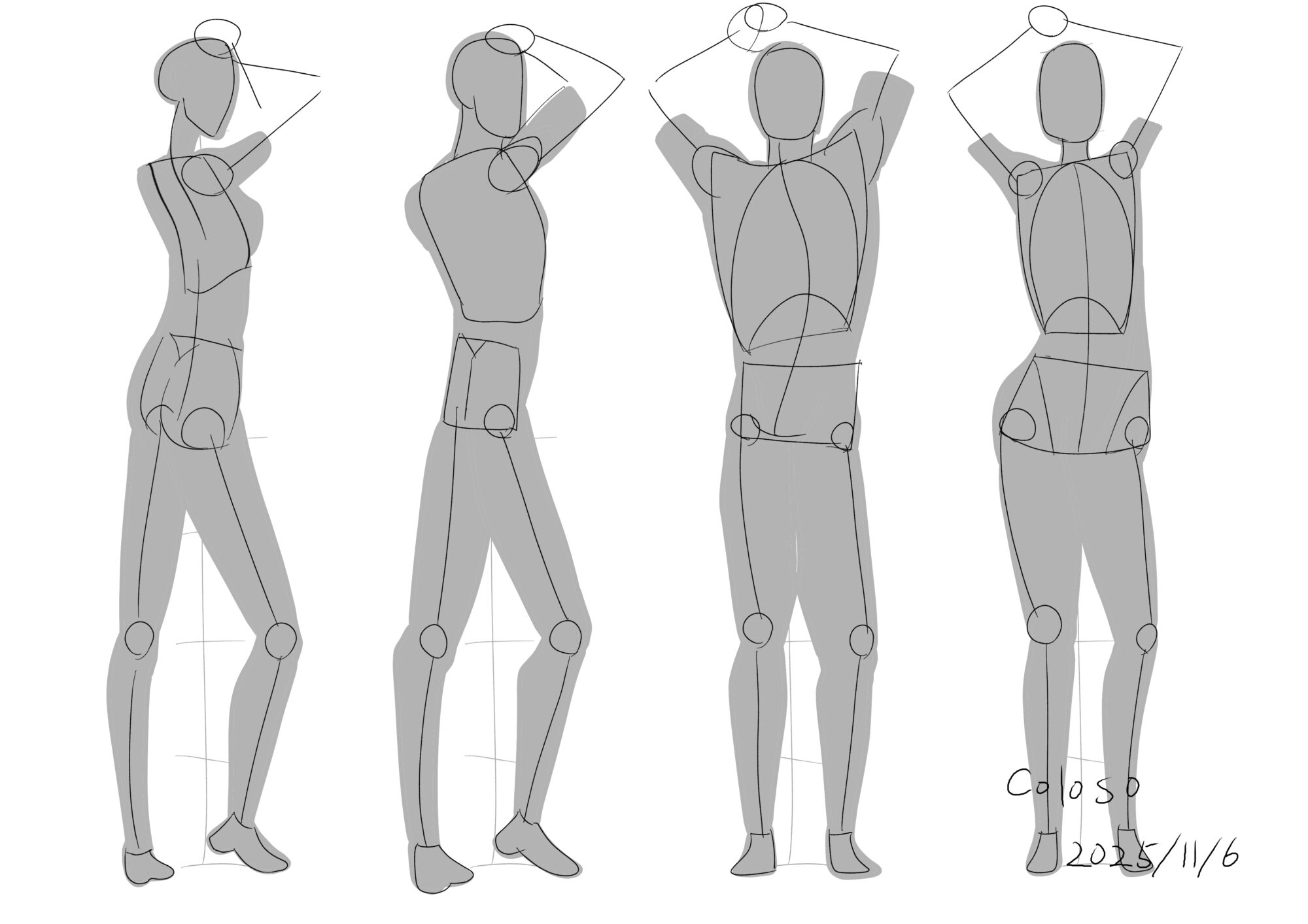 こちらが初めて講座の内容を真似て練習した人体(比率とシルエット)です。まだまだ上手く描けなくて(´;ω;`)ウッ…