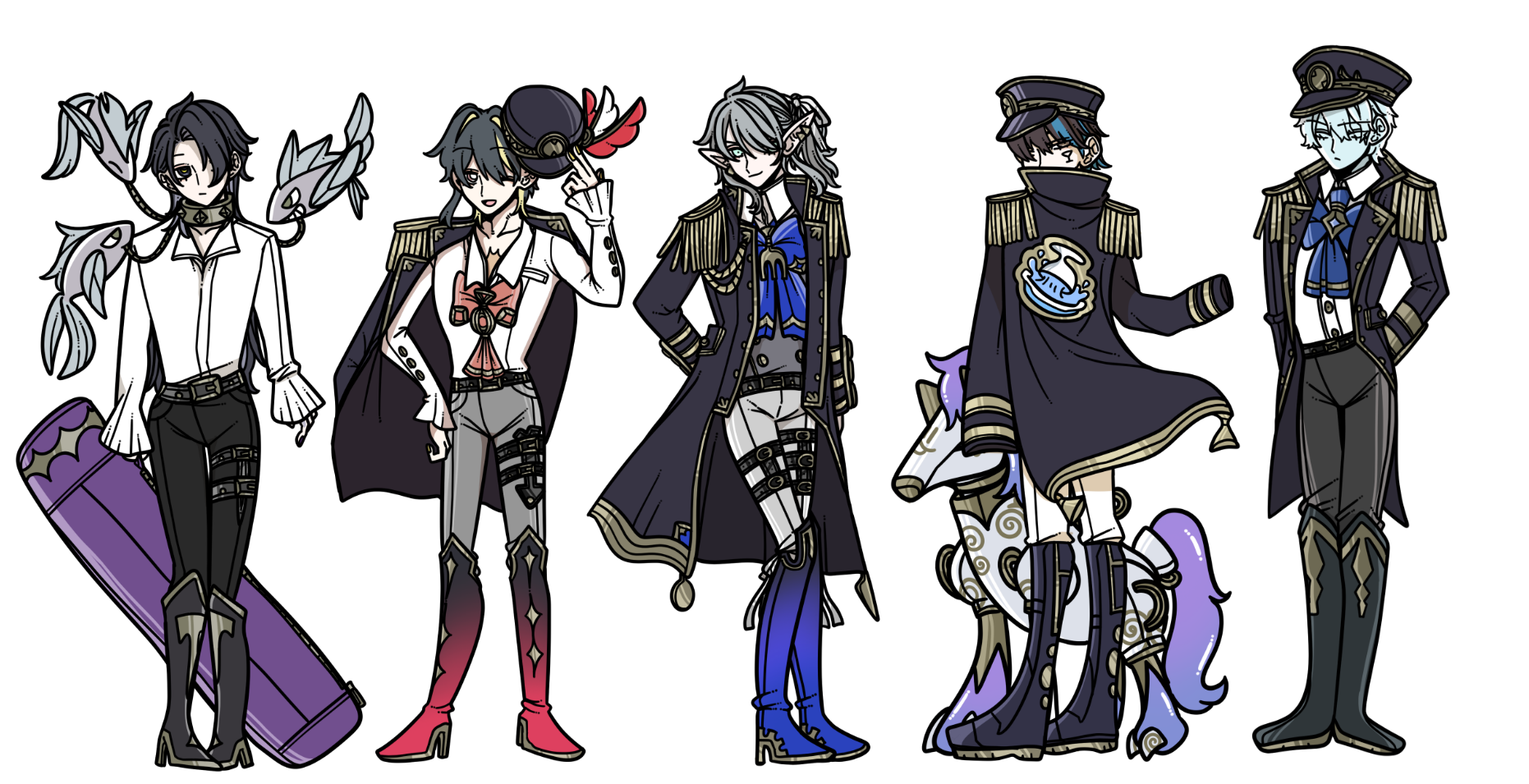 この音楽バンドグループのモチーフは「食器類」です。没案を見た感じ、船長の服装っぽいので「船をモチーフにしたのかな?」と勘違いしてしまいそうなデザインです。食器類をモチーフにしたとは思えませんね。、、、まあ今のデザインもあまり食器類をモチーフにしたとは思えないのですが、、、。(難しい)
