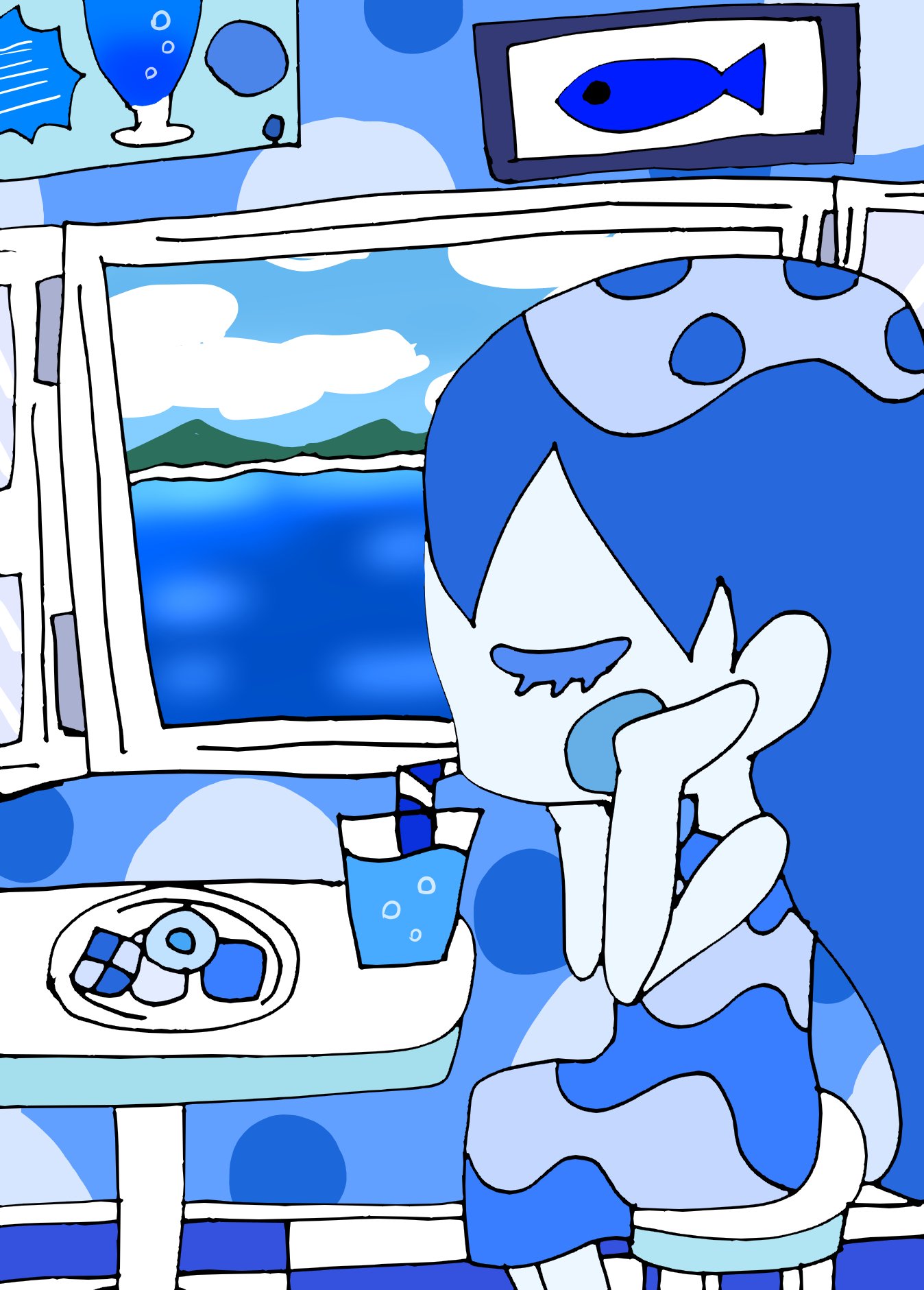 窓を開けて夏の風を感じながらサイダーを飲んでいる女性を描いてみました。