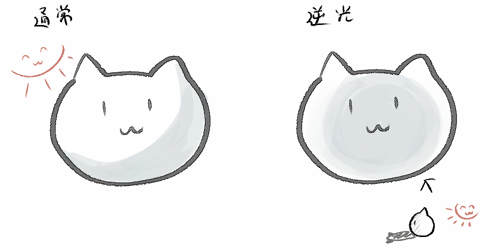 まず逆光というのは、被写体が光源を背にしている…つまりは人物を暗い色で塗って、輪郭に近い部分を光が当たったように描写することです。