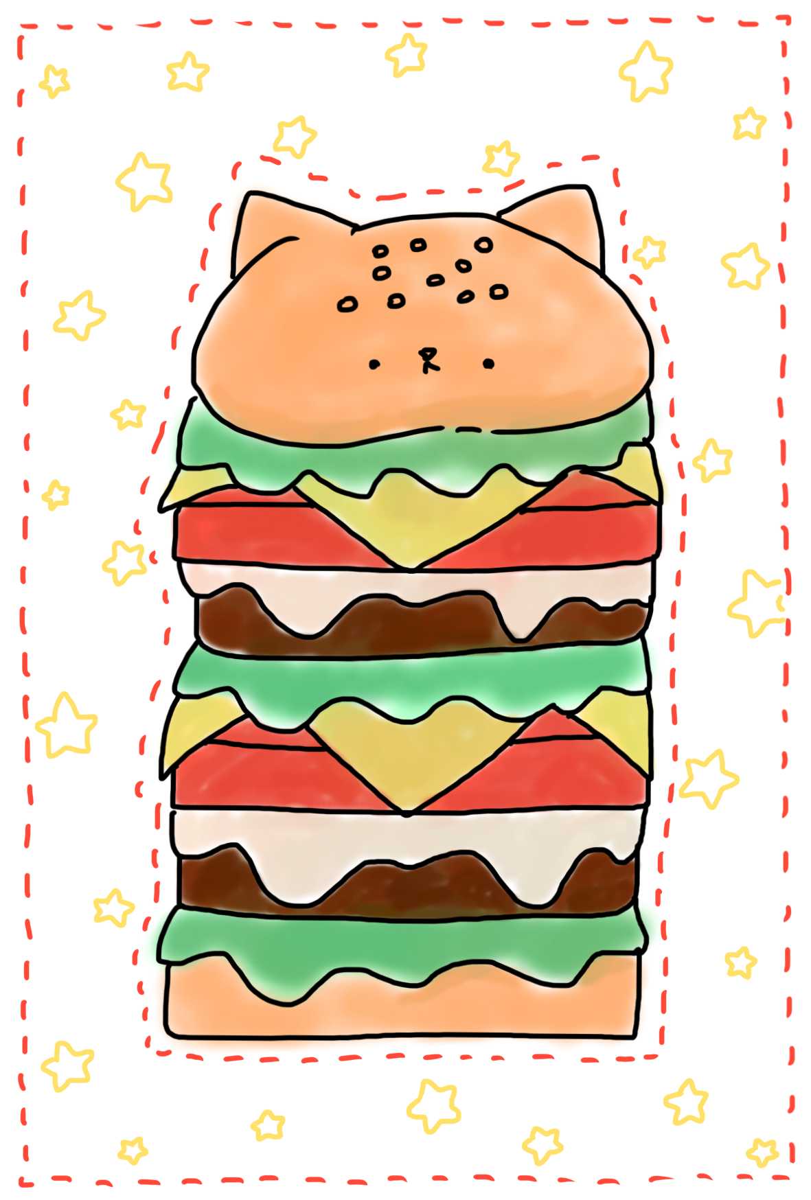 猫×食べ物 (ハンバーガー)を題材にしたこの作品では、バンズが猫になっており、一口では頬張りきらないでっかいハンバーガーを描きました。