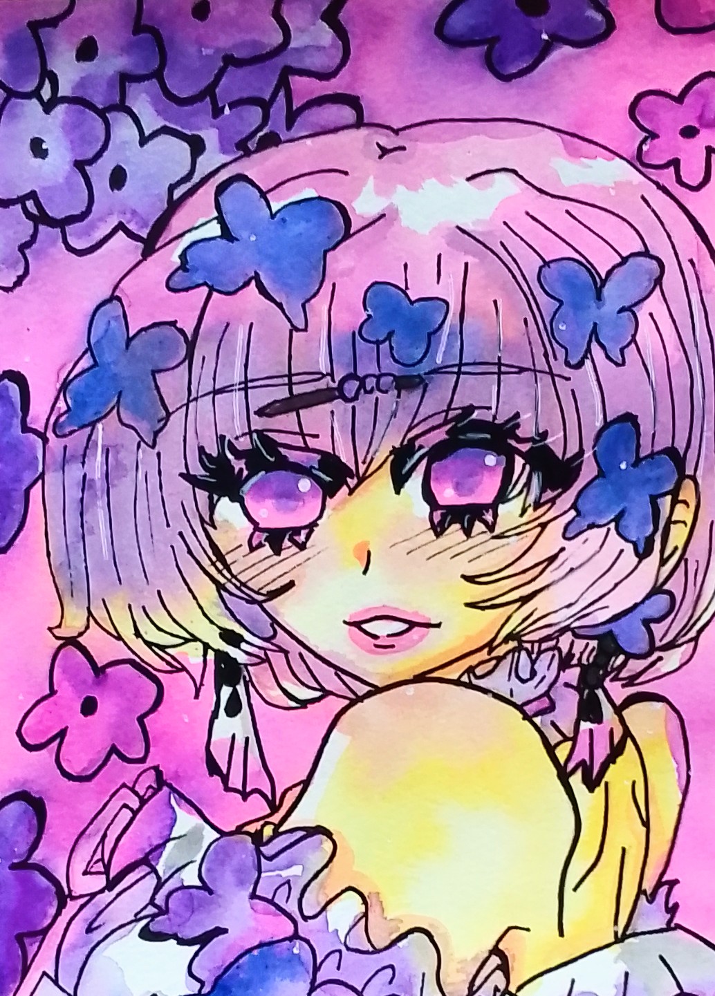 紫の花と蝶々の飾りが美しいお姫様を描いてみました。微笑みも素敵ですね。