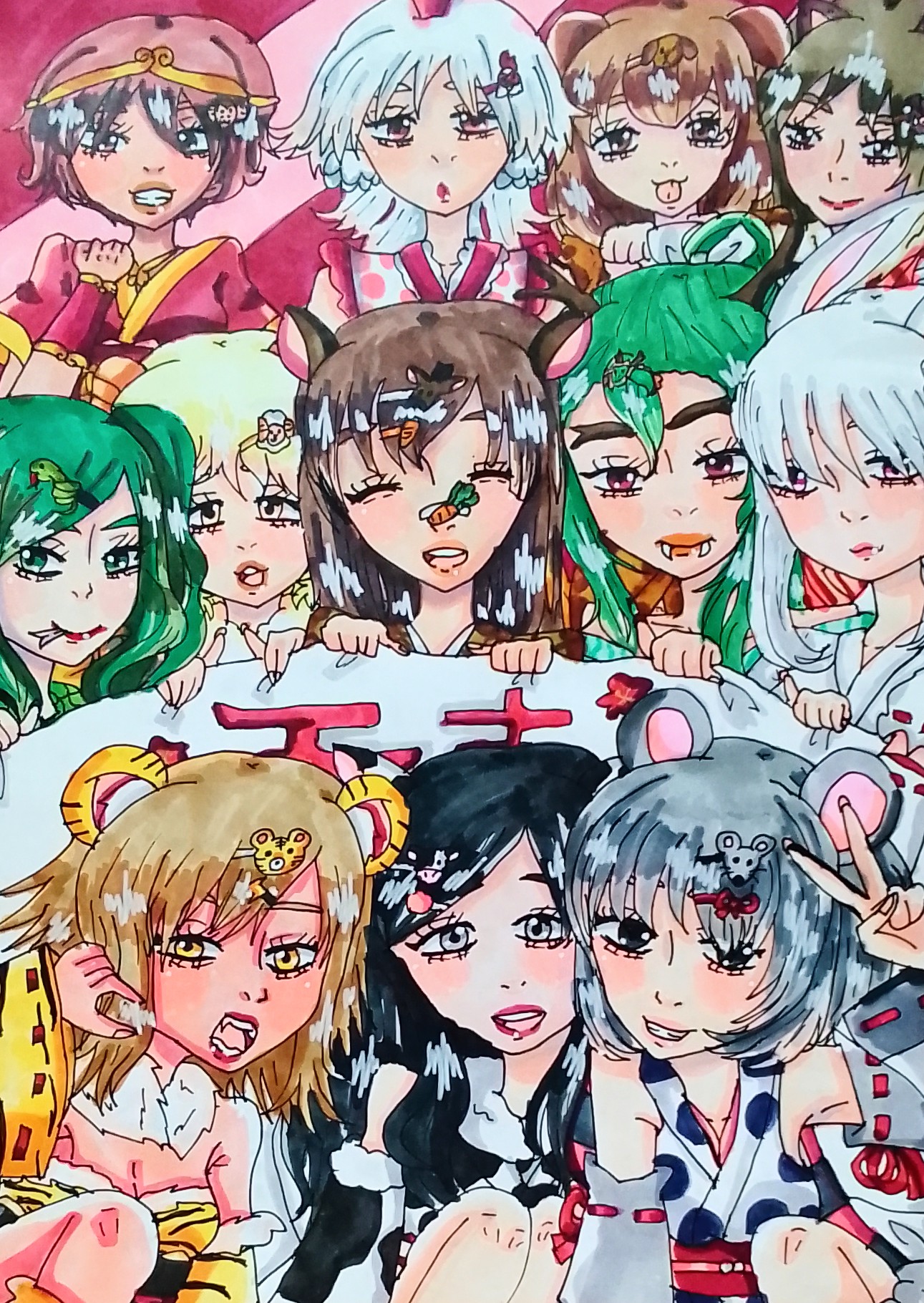 十二支の擬人化の女の子達を描いてみました。集合絵を描くのは初めてでしたが楽しかったです。