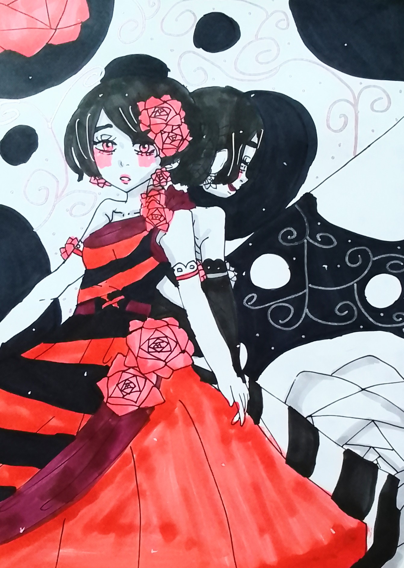 赤薔薇と白薔薇のドレスを着ている女性を描いてみました。