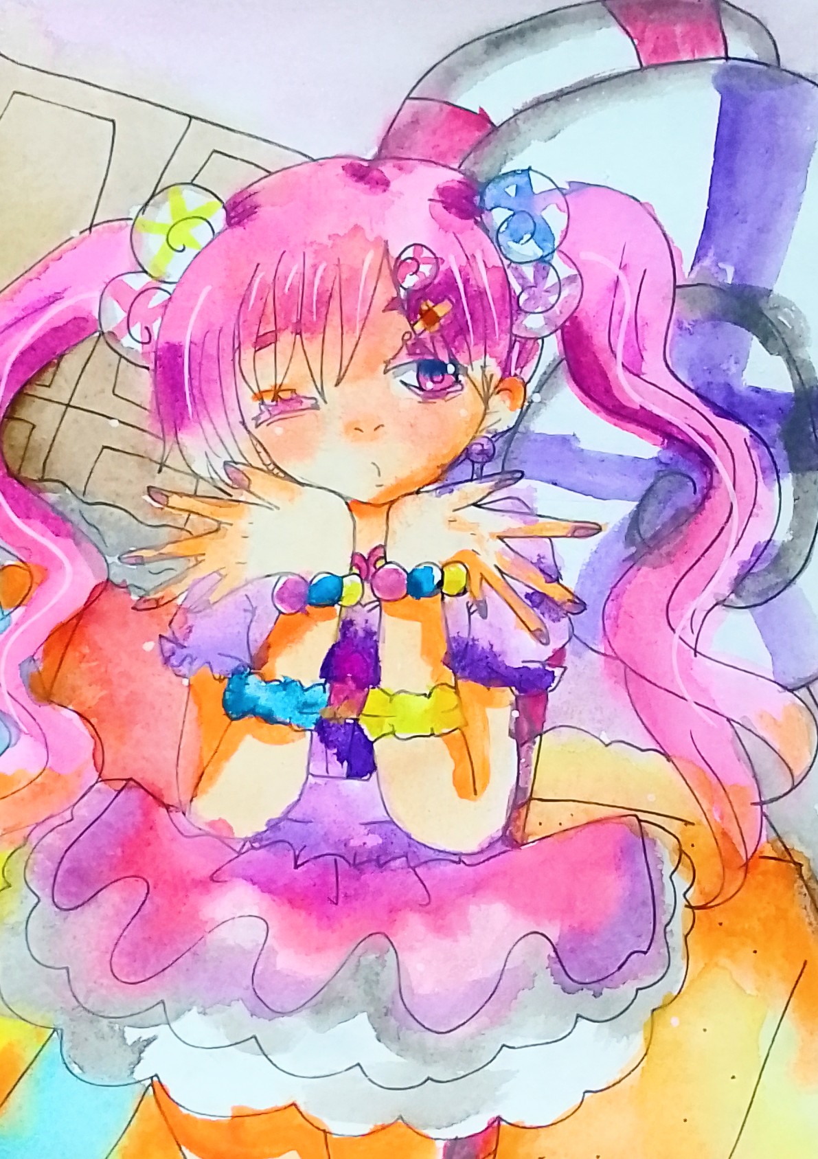 お菓子っぽい可愛いコーデを着ている女性を描いてみました。