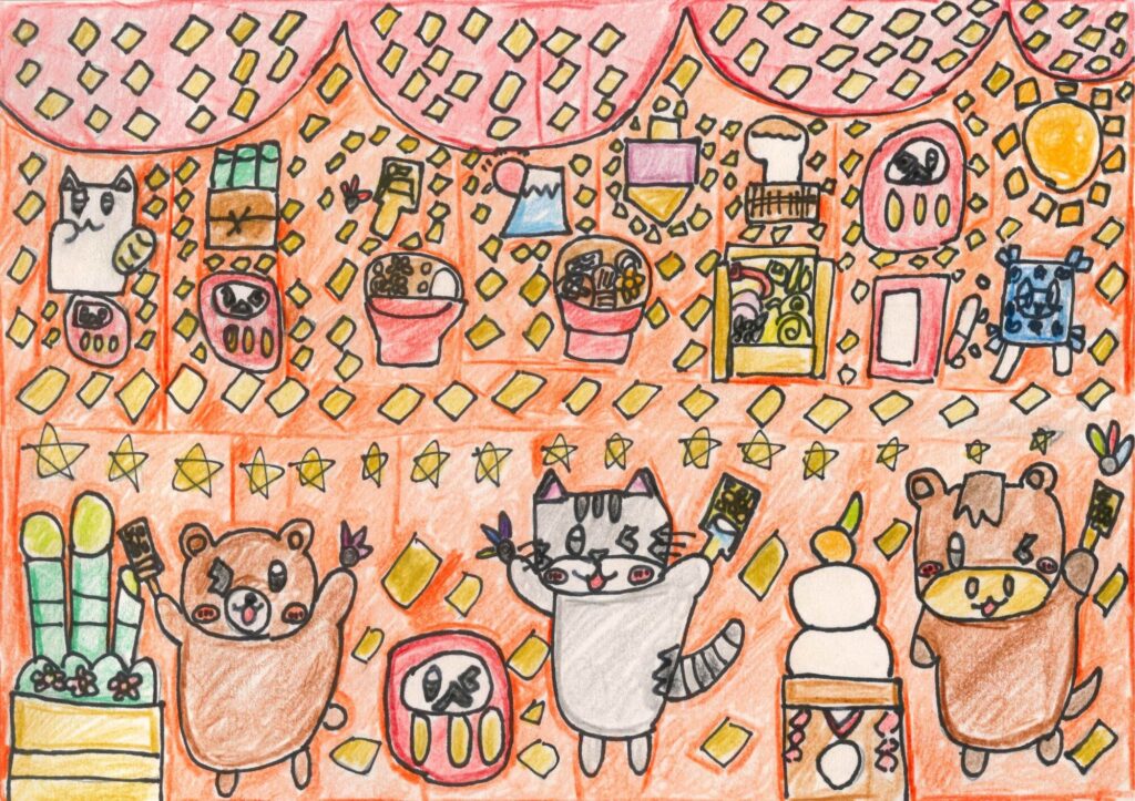 背景に、だるまや門松を描いて華やかに見えるように工夫しました。