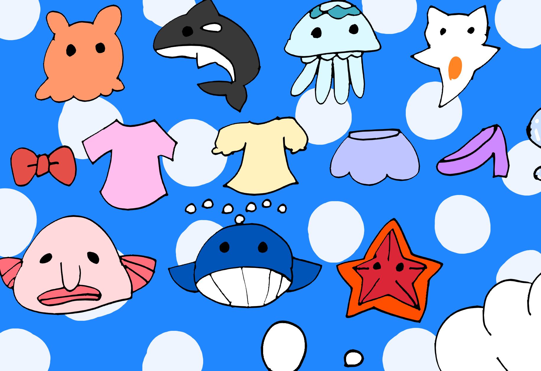 海の生き物などがモチーフのドレスを着ている女性や女の子イラストを描いてみました。