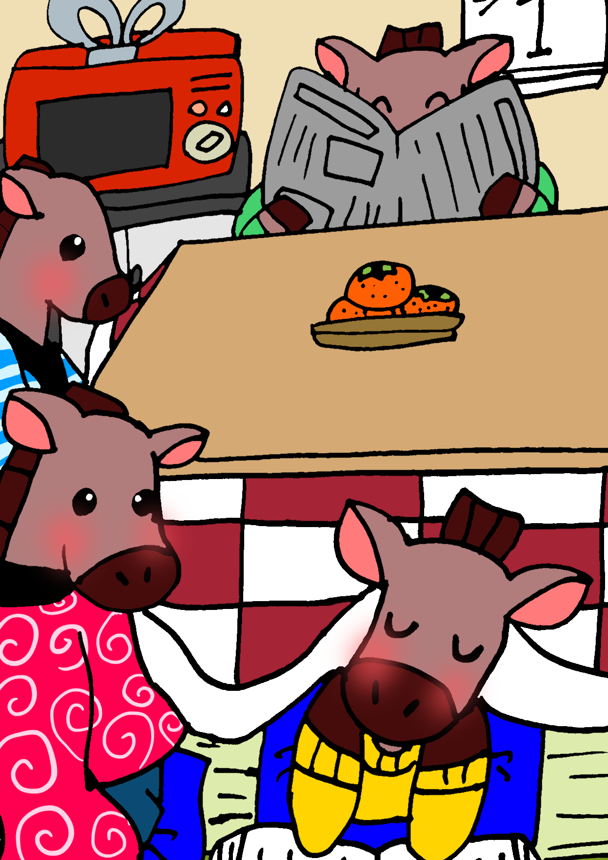 色んな形でこたつに集まってくつろいでいる馬ファミリーを描いてみました。家族団らんでいいですね。