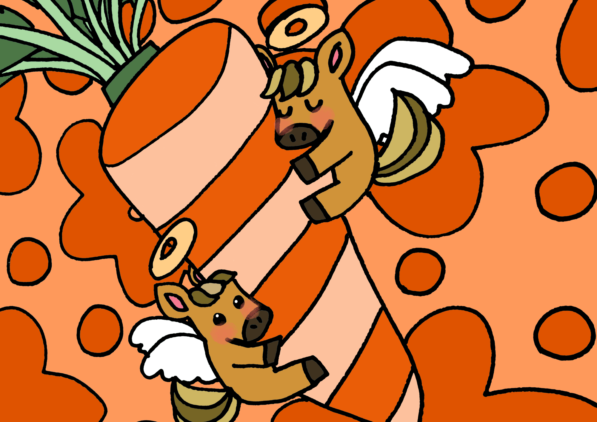 ニンジンを抱きしめている2匹の馬の天使を描いてみました。