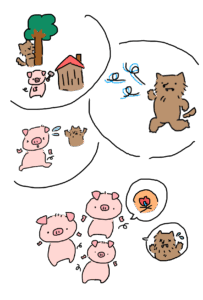 子ぶたが頑張って家を作ってる間にも、オオカミは後ろからチャンスを今か今かと探っています…。