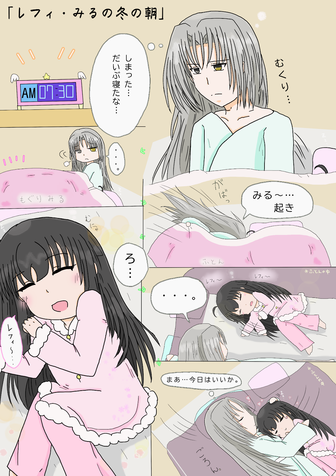 本当は朝5時とかから起床して朝の鍛錬を毎日しているレフィールですが、彼も冬には寝坊する事もあります。隣に物理的にあったかい存在がいるのでね。冬に布団に潜ってくる猫とかを想像するとわかりやすいでしょうか?