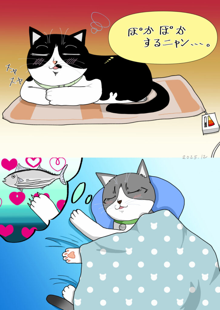 ちーくんは電気カーペットの上で熟睡、ここちゃんはふわふわの毛布を被って大好きなカツオを追いかけている夢を見ています。本物のふたりの寝相はかわいいので、いつか写真を見せれたらいいかな?と思っています!(*´艸`*)