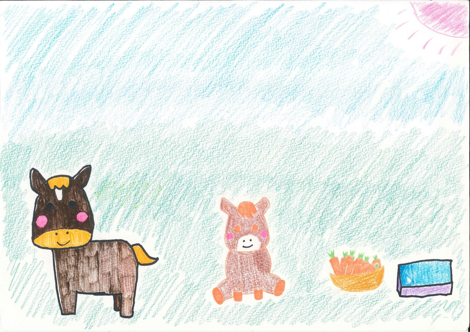 人参と水飲み場を描いて可愛らしい馬を描けて良かったです!
