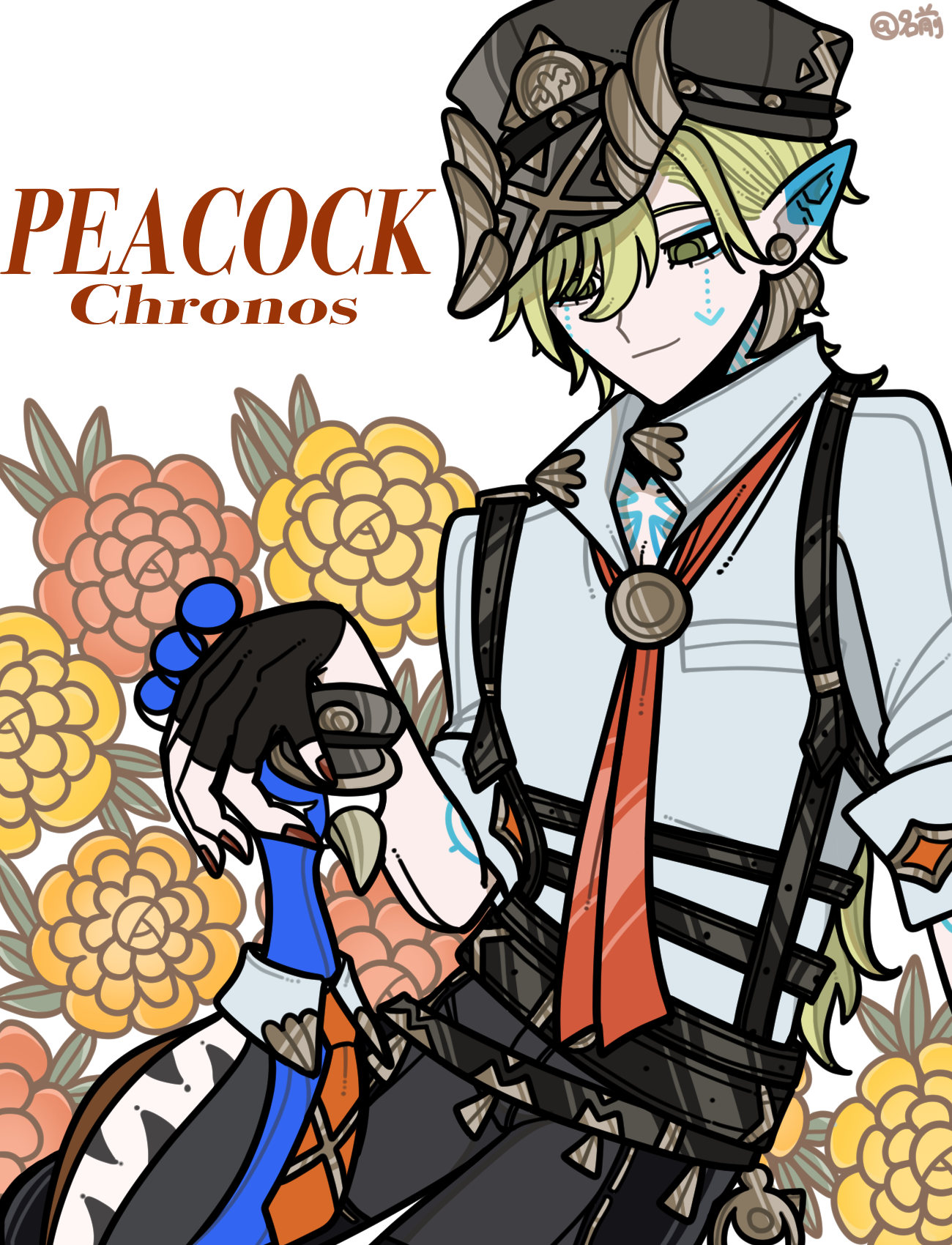 彼の本名は「パゴーニ」なのですが芸名は「ガイア」という名前です。彼のモチーフのものは「孔雀座(星座)」です!孔雀は華麗な印象があるので、華麗で美しい美貌のキャラクターにしました!