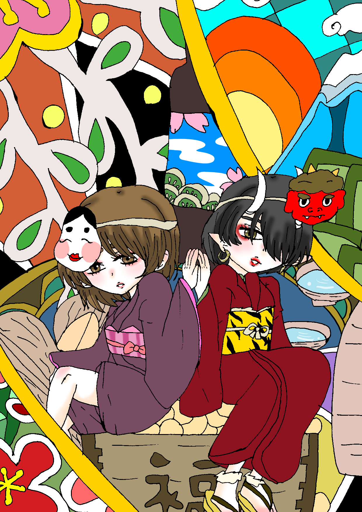 2月3日は節分の日なので、鬼の少女と福をおびき寄せる少女を描いてみました。
