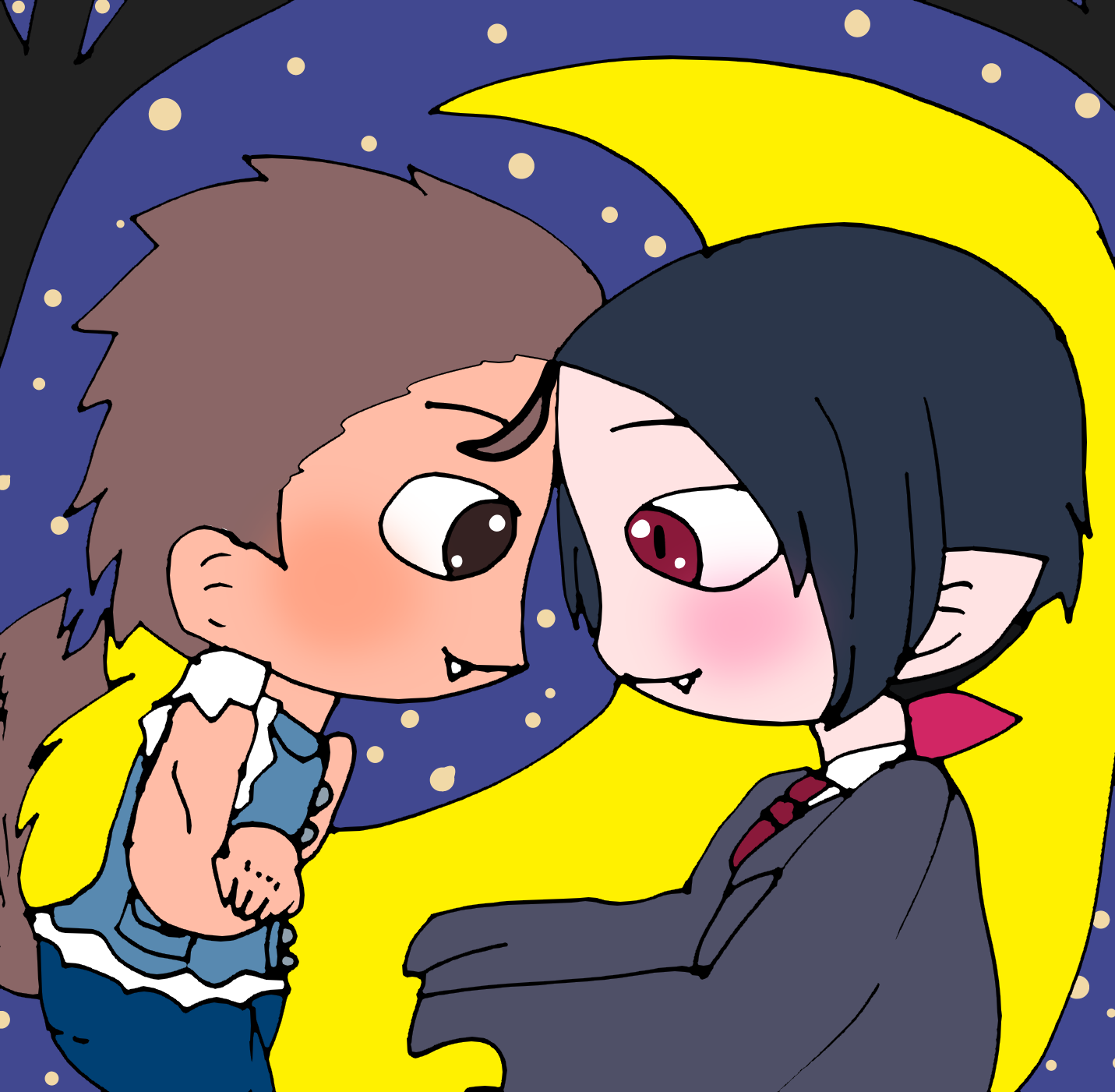 お互いに見つめ合っている狼男と吸血鬼の男を描いてみました。