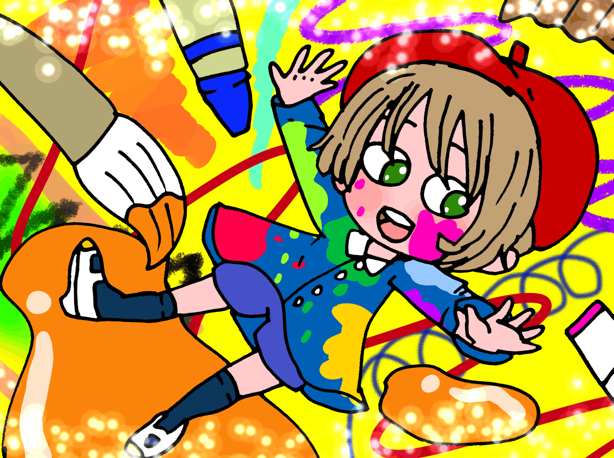 色んな画材に囲まれて幸せそうな男の子を描いてみました。