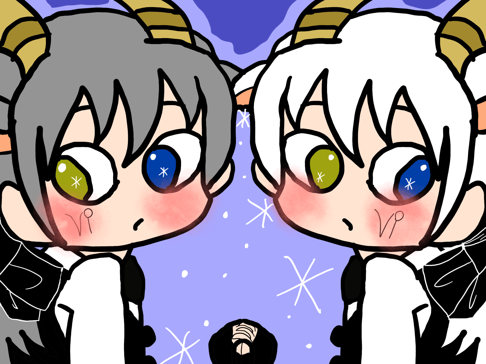 白山羊と黒山羊の双子の男性を描いてみました。