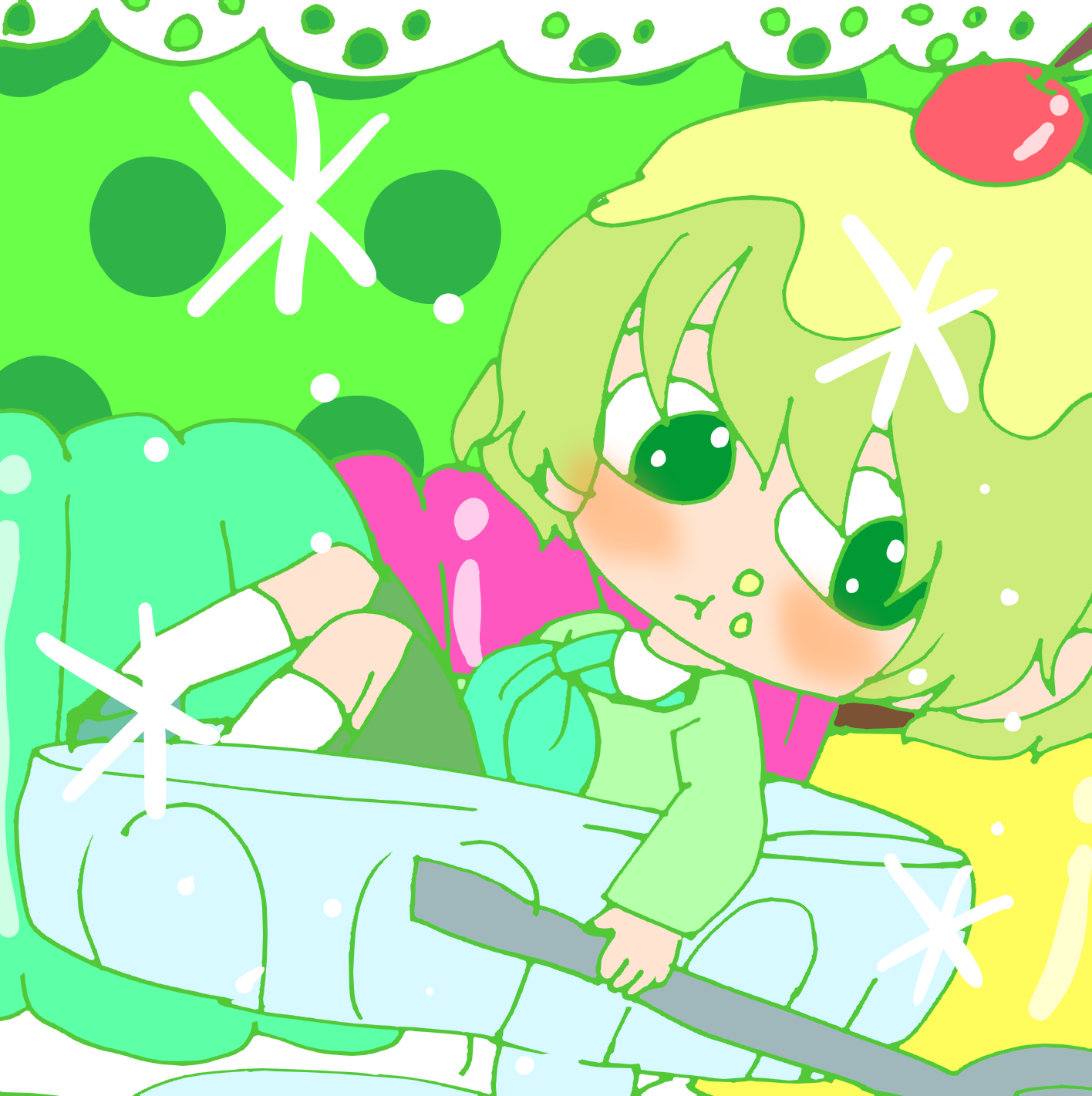 ゼリーとプリンに囲まれて幸せそうな男の子を描いてみました。