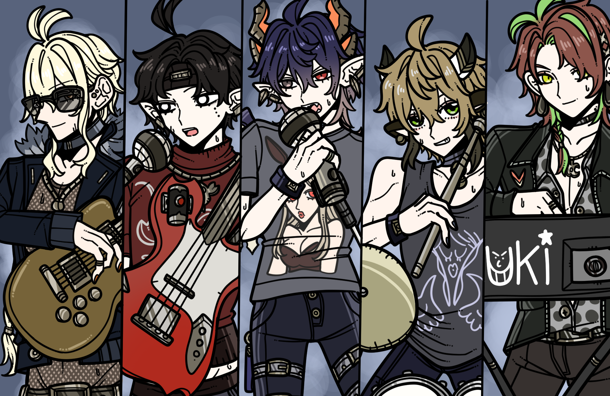 今回の一枚絵はいつもと違う服装にしました!それぞれのキャラクターに合いそうな服をデザインしてみました!…………1人派手な服装のメンバーがいますが笑