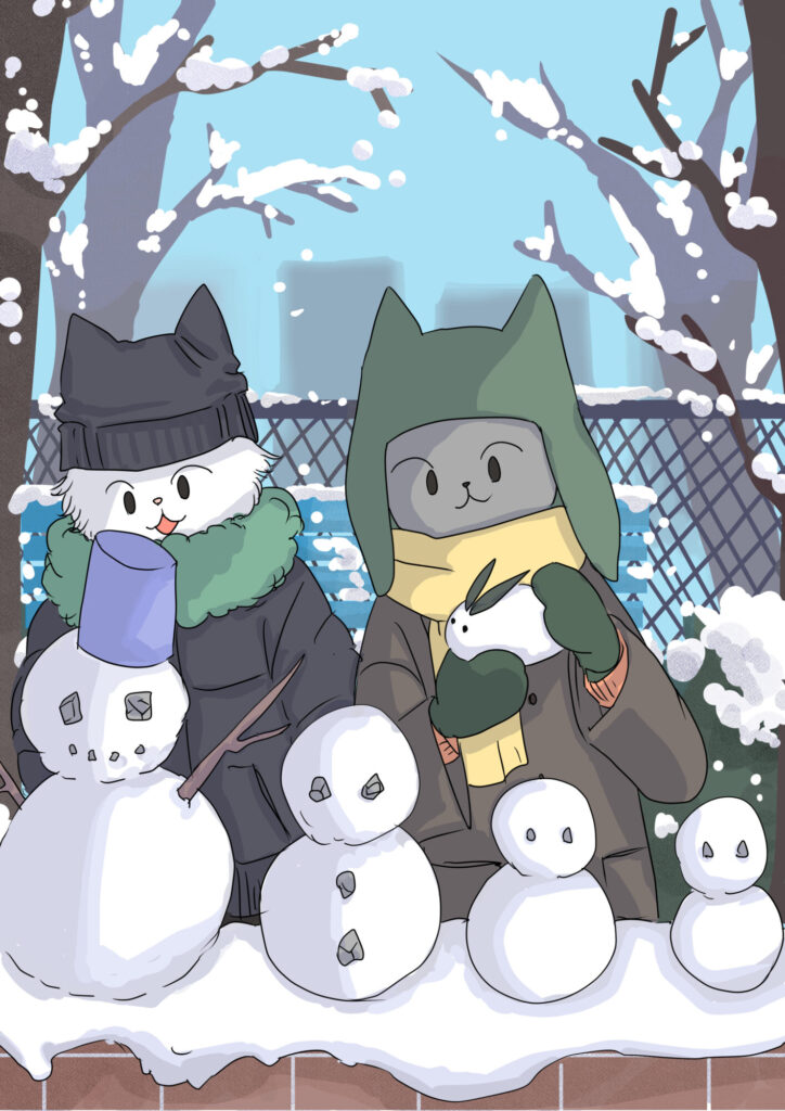 今回は、公園で雪だるまをたくさん作る猫たちのイラストを描きました。