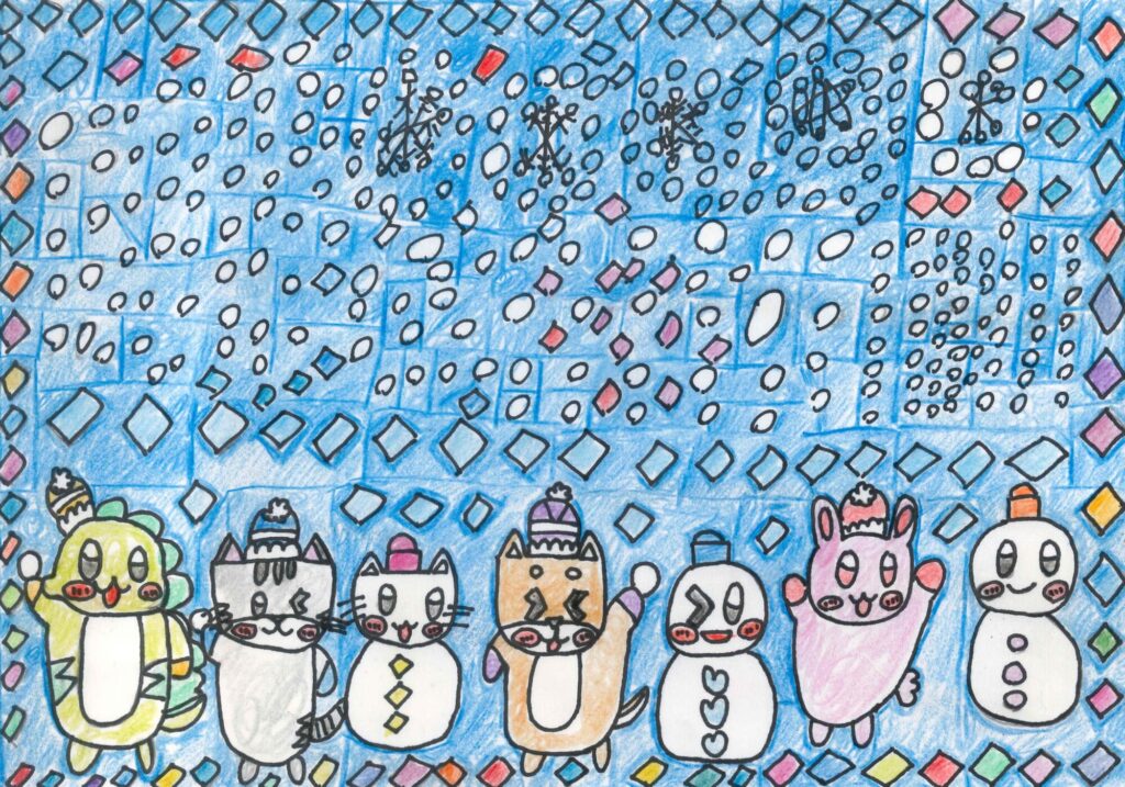 背景に、雪の結晶や雪だるまを描いてきれいに見えるように工夫しました。